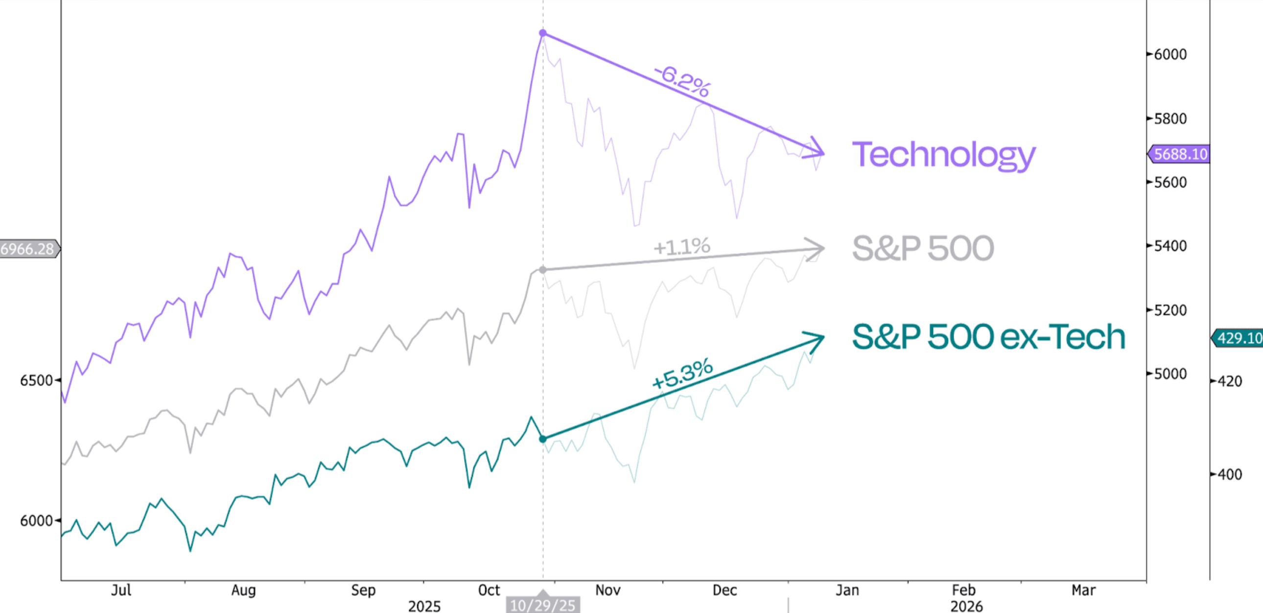 This chart shows how the tech sector, the S&P 500, and the S&P 500 minus the tech sector has been performing from end-October till now.