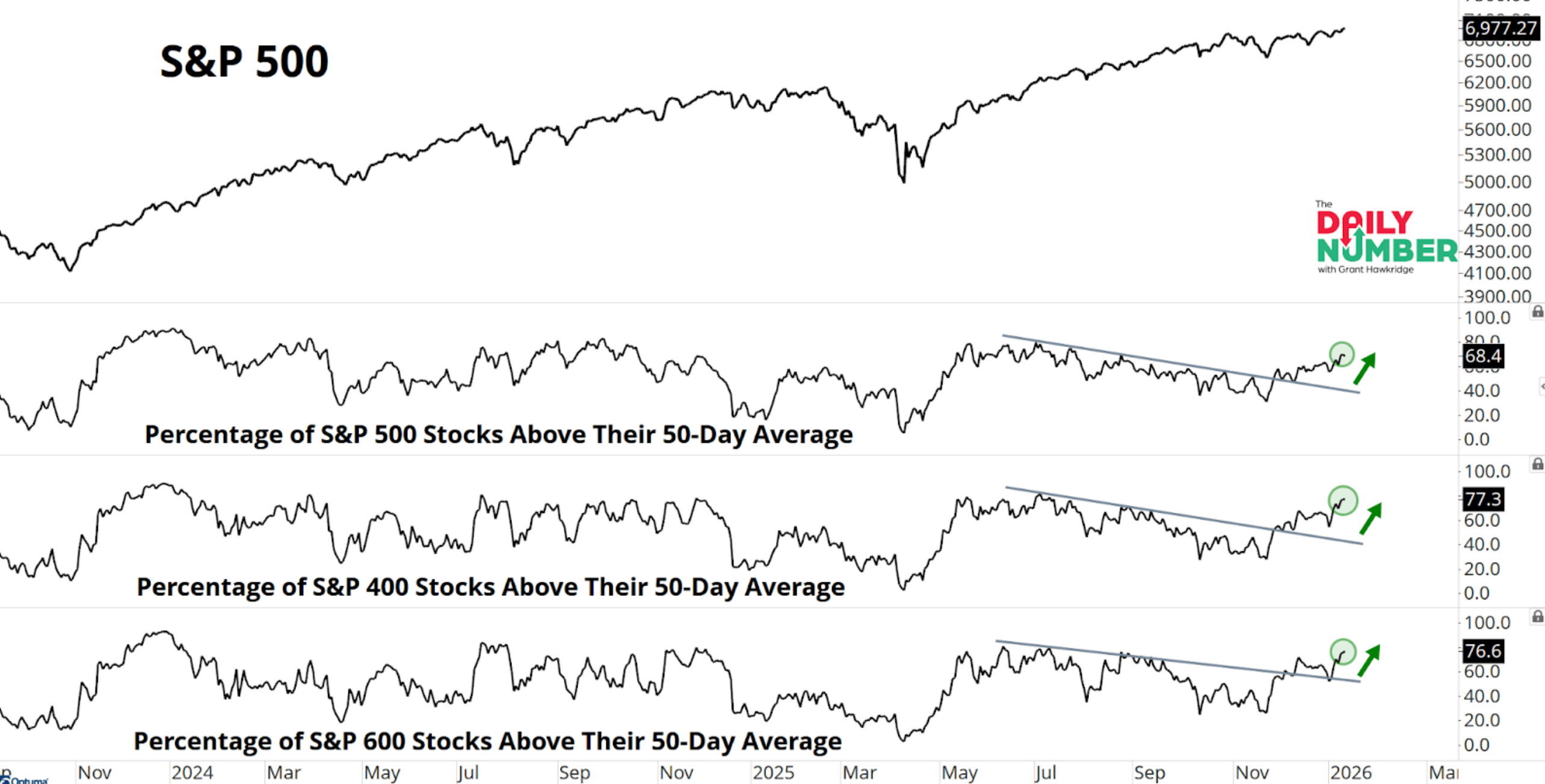 This chart shows the percentage of S&P 500 (large-cap), S&P 400 (mid-cap), and S&P 600 (small-cap) stocks trading above their 50-day moving averages.