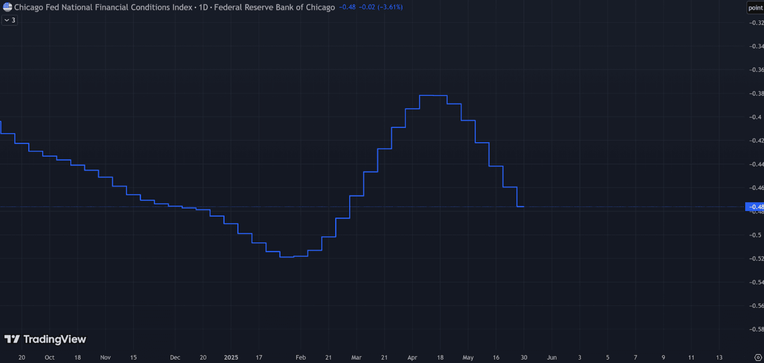 The above is the Chicago Fed National Financial Conditions Index – a measure of how much liquidity there is in the system.