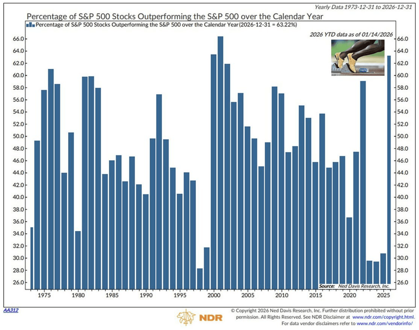 This chart shows the percentage of S&P 500 stocks outperforming the S&P 500 index dating back to 1975.