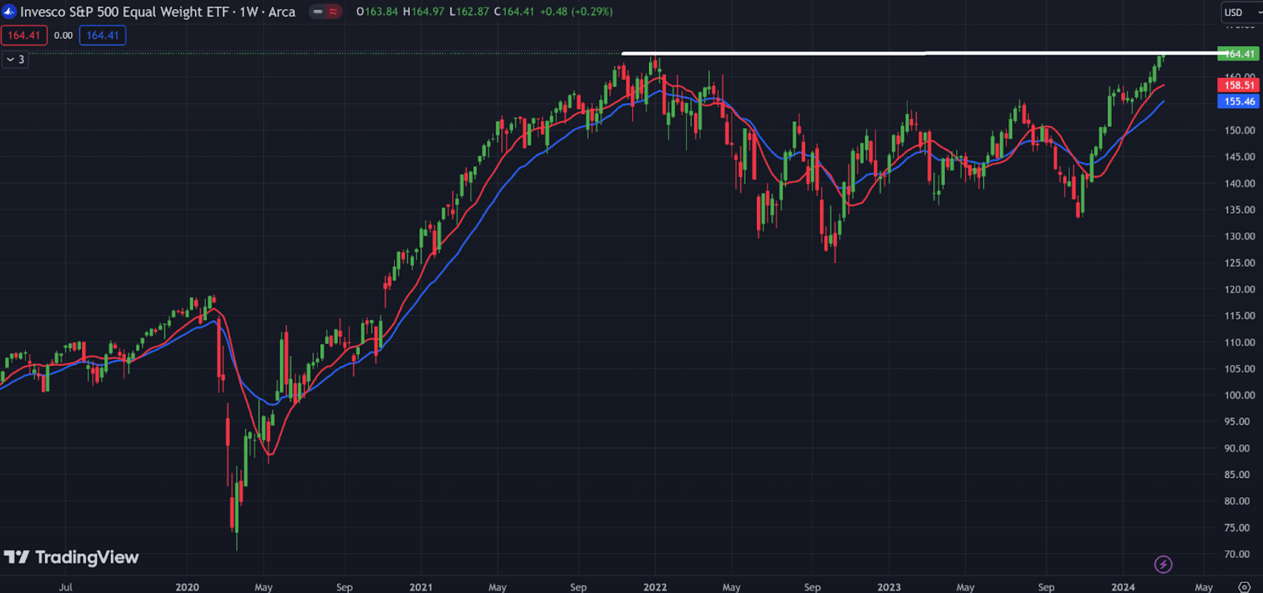 This is RSP – the Equal Weight S&P 500 Index – essentially how the S&P 500 index would look if every stock in there was weighted equally instead of by market cap.