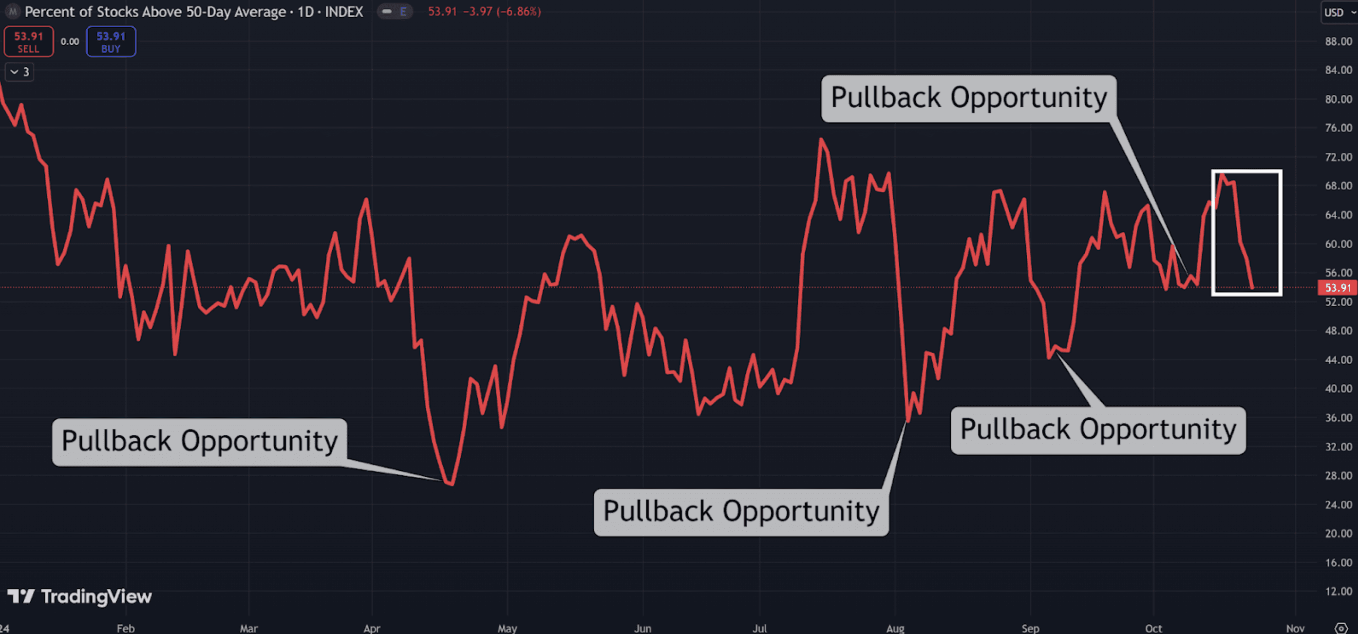 This chart shows the percentage of stocks trading above their 50-day moving average for this year.
