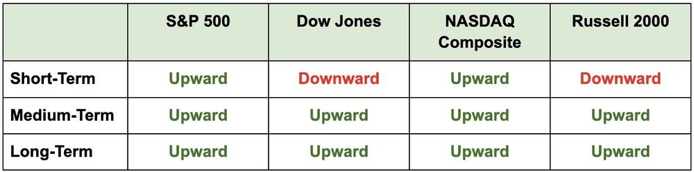 Note: All indexes closed sharply lower yesterday – sending the short-term directions for the Dow and the Russell 2000 downward.