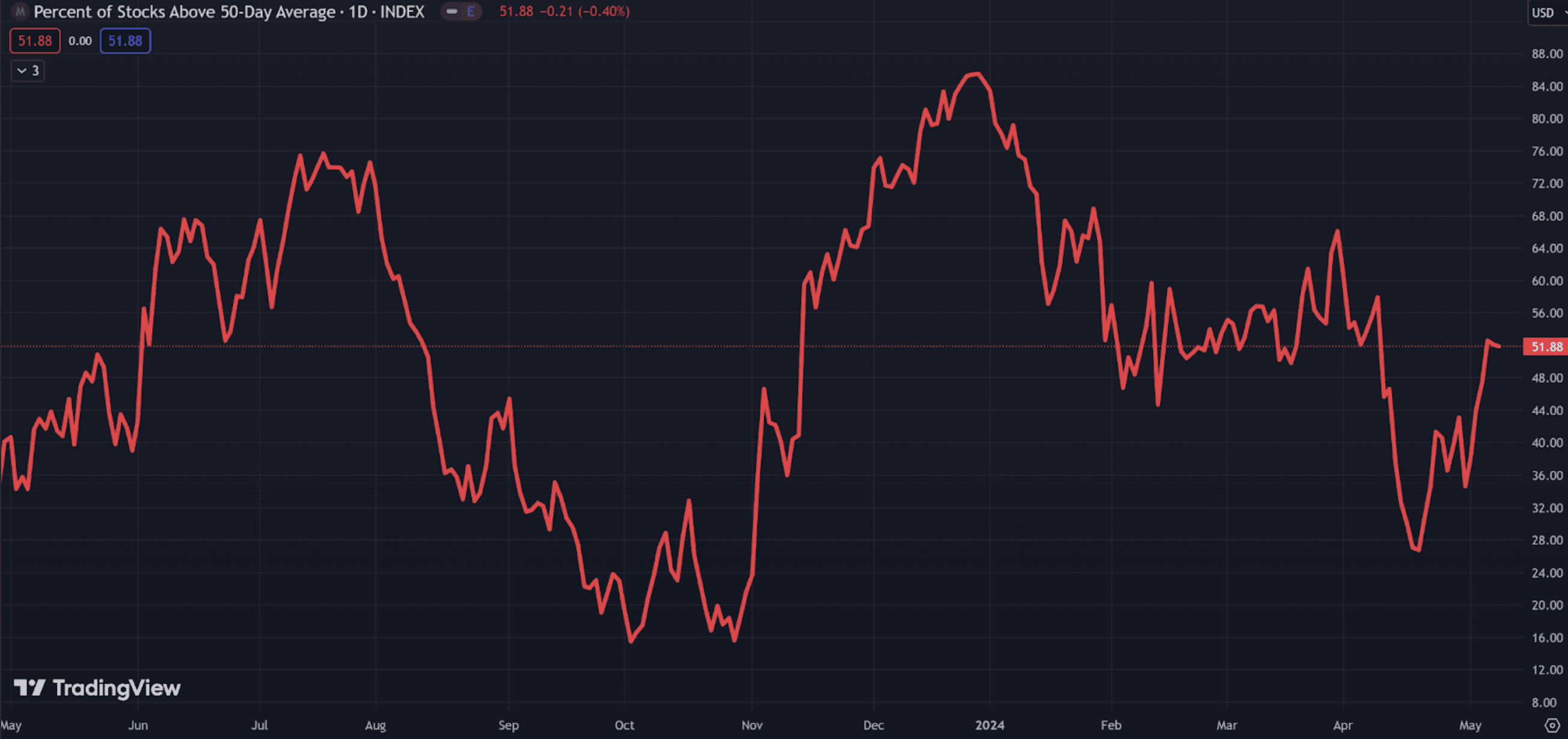 This is the percentage of stocks that are trading above their 50-day moving average – a sign of medium-term momentum.