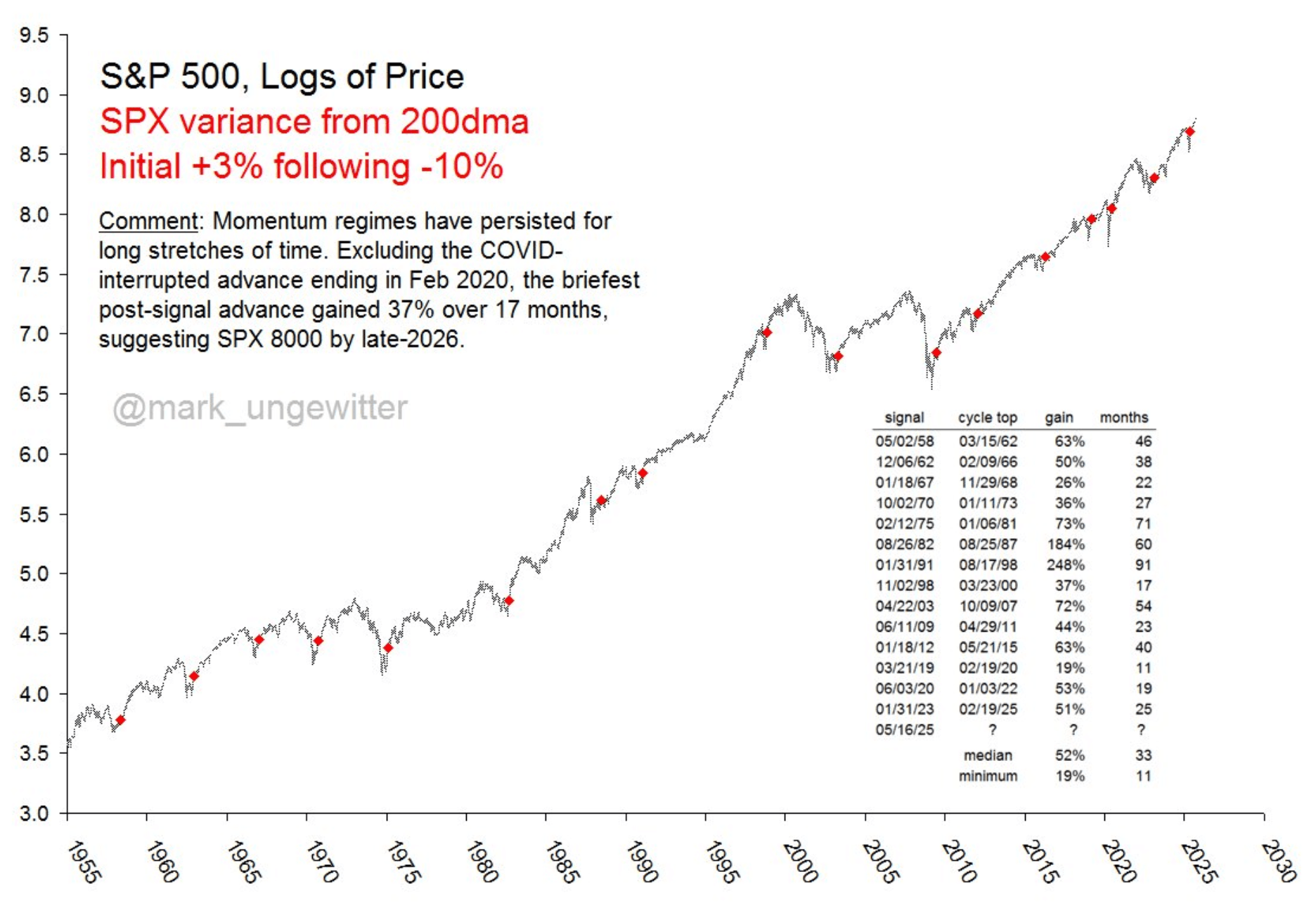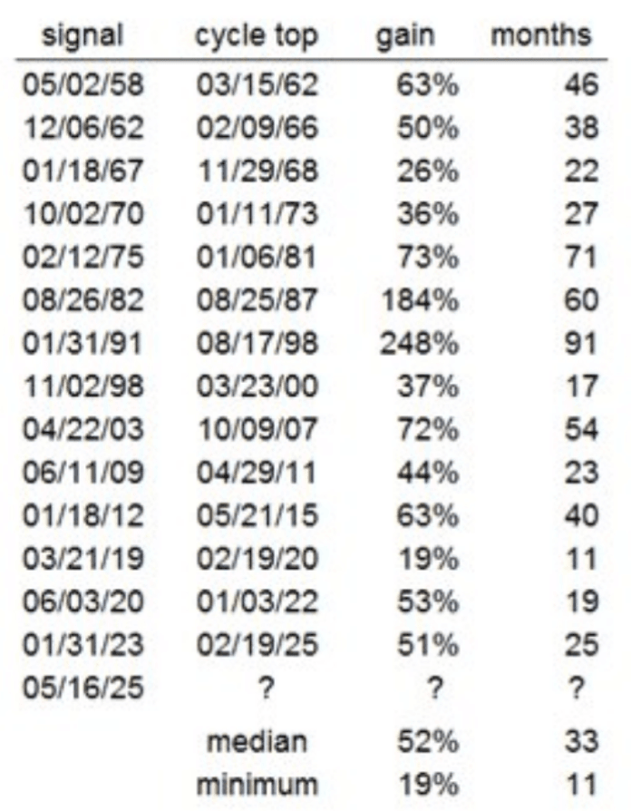 As you can see, in most of these cases the market gained a median of 52% with the momentum cycle lasting 33 months.