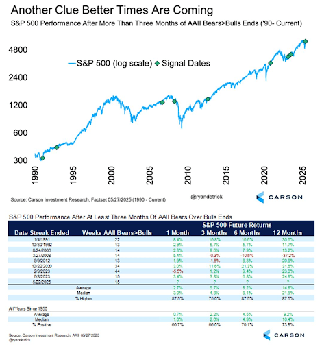 This table shows how the S&P 500 has performed in the past after a at least 3-month streak of AAII bears outnumbering the bulls have ended.