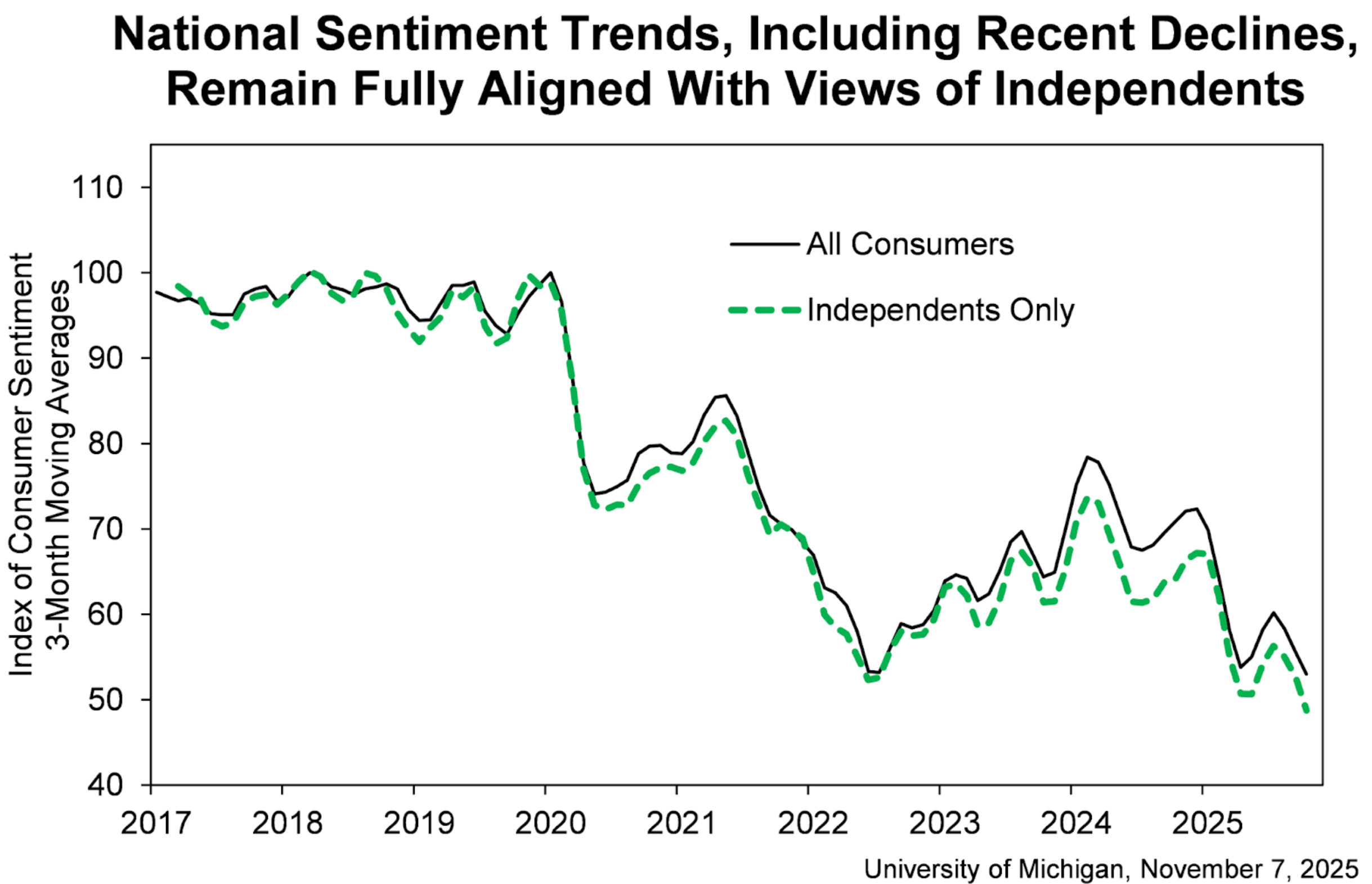 This chart shows the results of the monthly consumer confidence survey conducted by the University of Michigan.