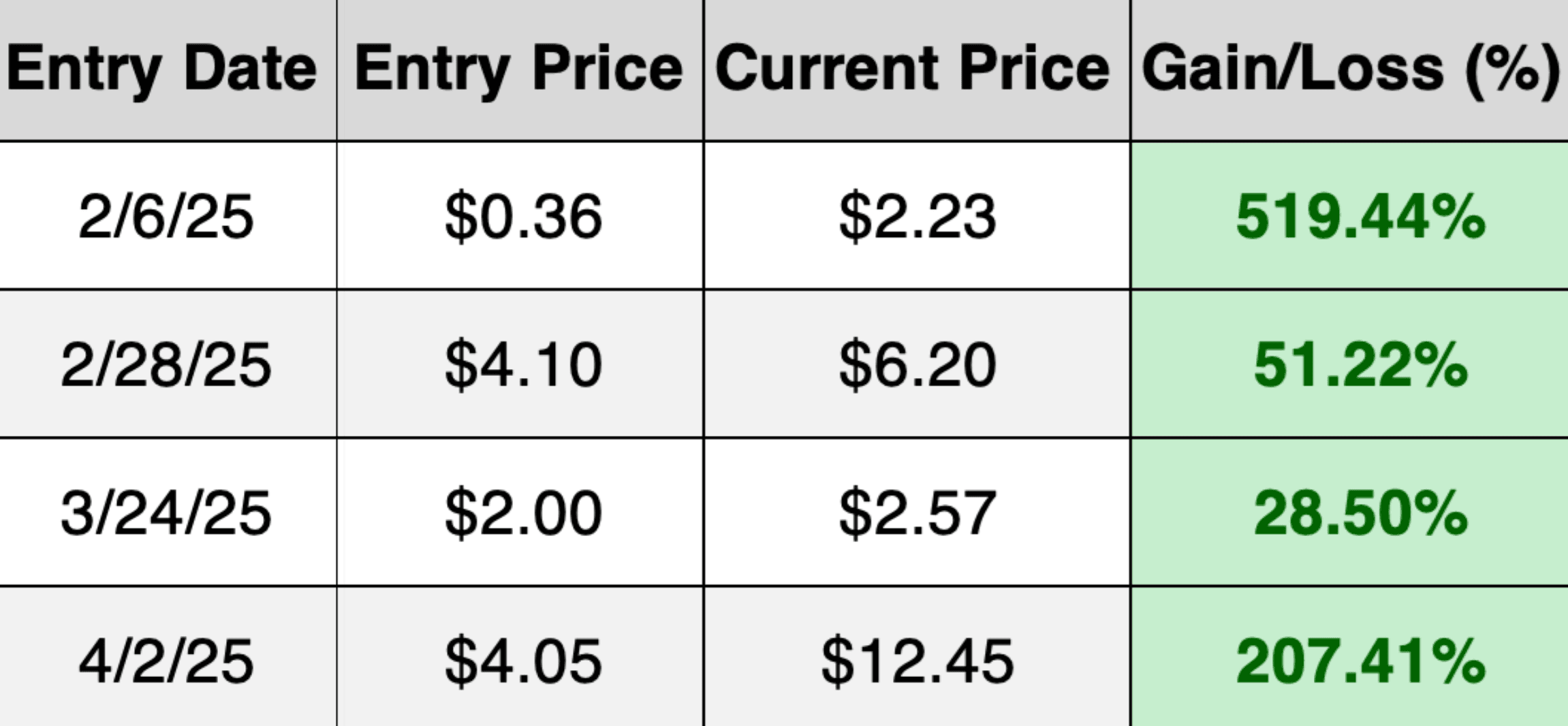 As of yesterday, this strategy could have allowed you to bank fast triple-digit gains of as high as 519% (just take a look at the open portfolio below).