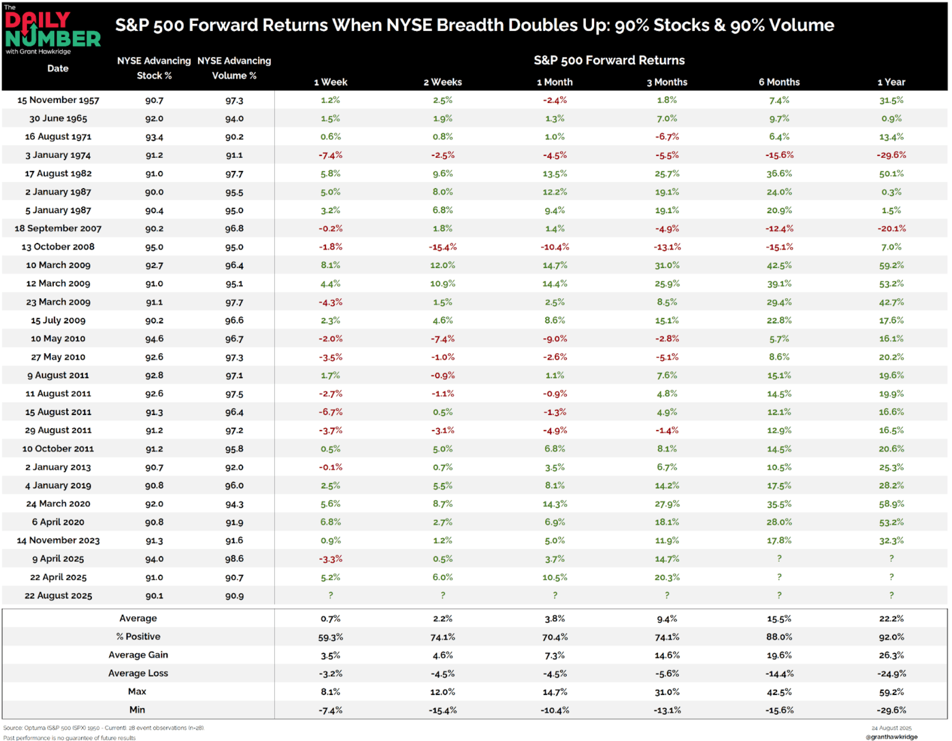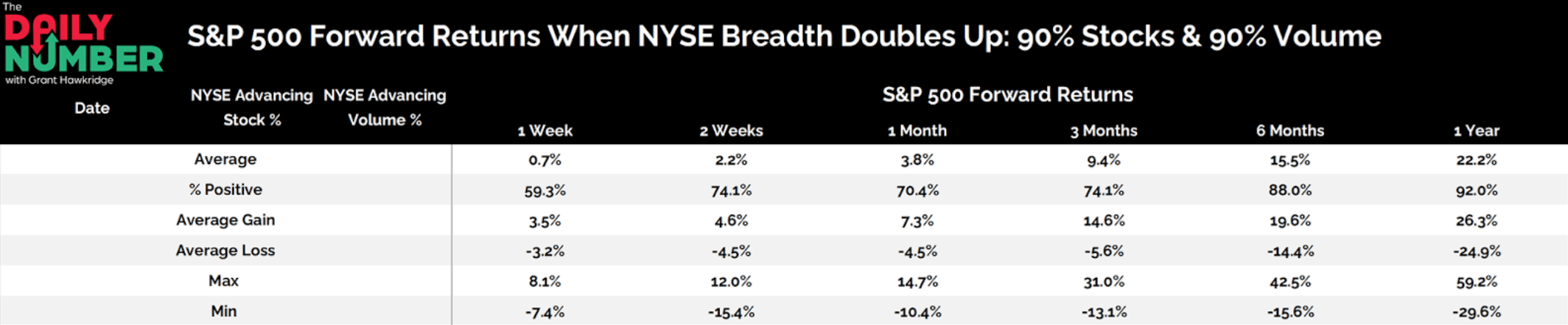 The table above shows how the S&P 500 has performed one week, two weeks, one month, three months, six months, and one year after past 90/90 days.