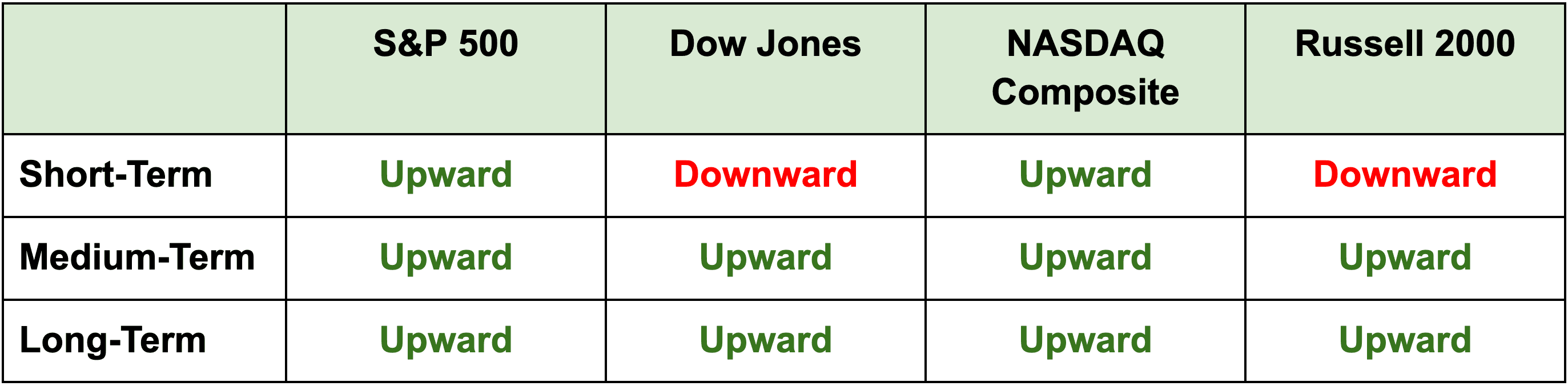 Note: All indexes except the Dow closed higher yesterday. Markets have been moving lower today on the latest data – with the short-term direction for the Dow and the Russelll 2000 flipping downward.