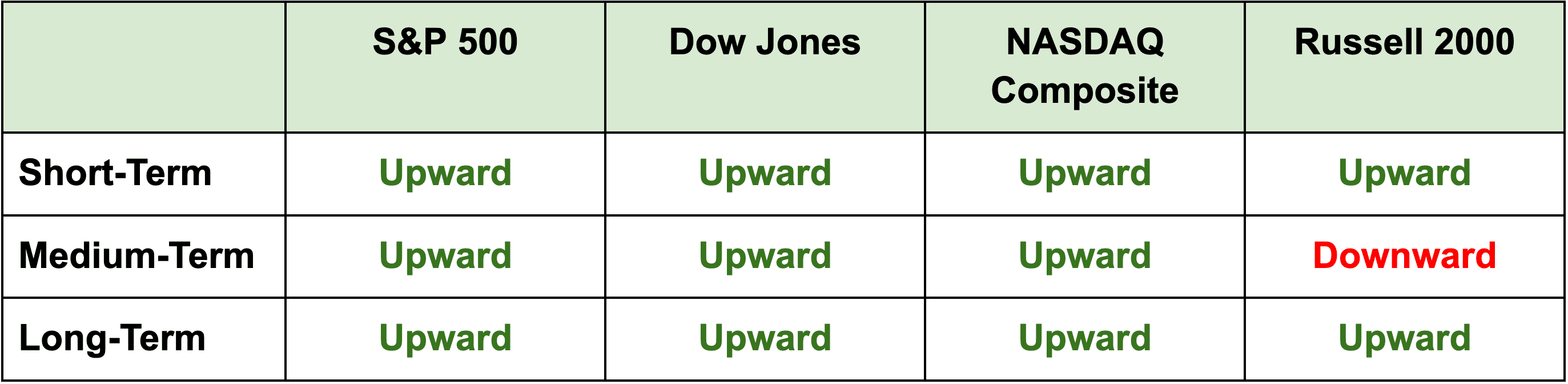 Note: All indexes closed marginally higher yesterday, with S&P 500 and the Nasdaq hitting another new all-time high. The short-term direction for the Russell 2000 flipped back upward.