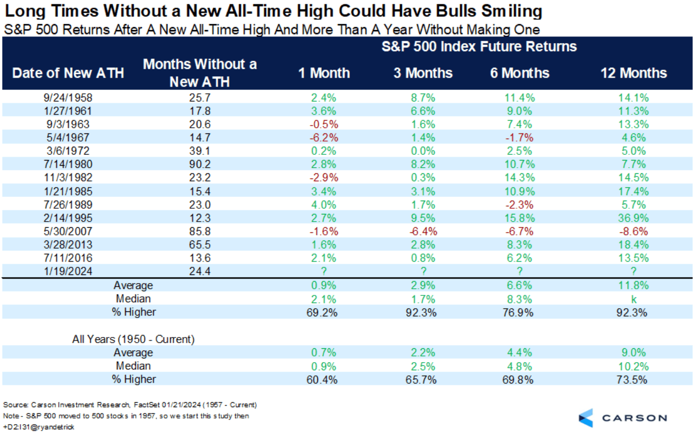 This chart shows how the S&P 500 index performed a month, 3 months, 6 months, and a year after a new all-time high that occurred after a year without making one.