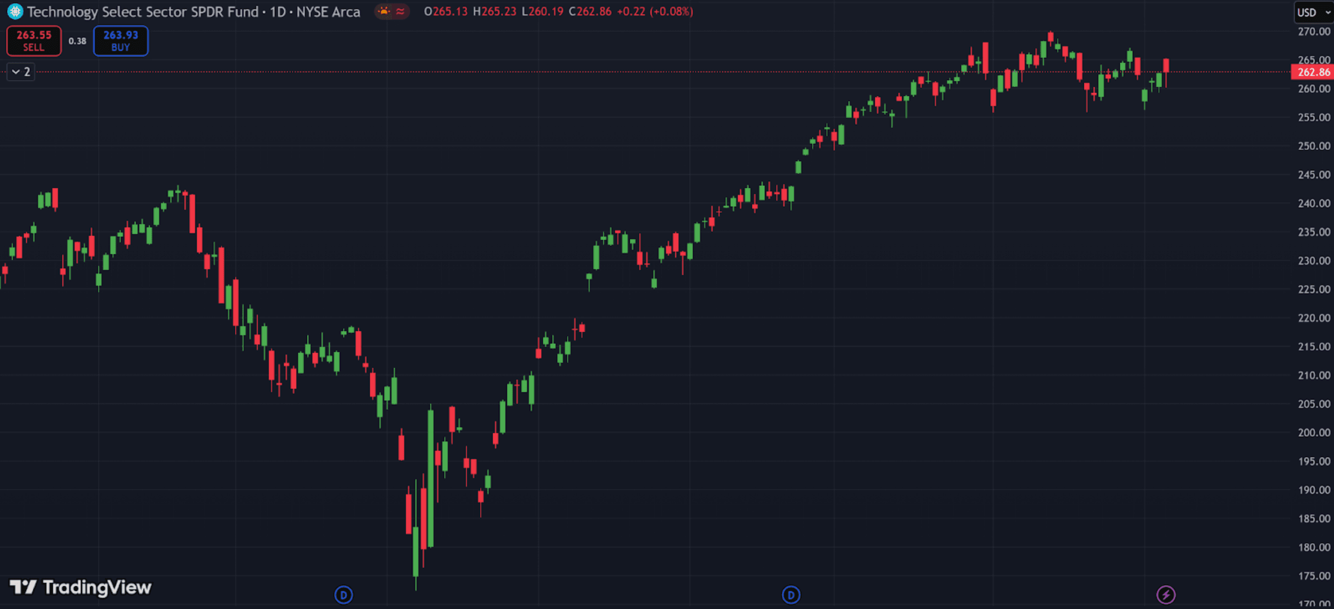 Even as the popular tech sector – represented by Technology Select Sector SPDR Fund (XLK) below – has continued to grind lower for the past few weeks.