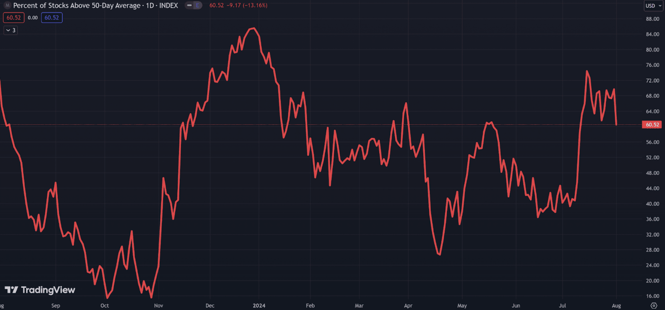 This is the percentage of stocks trading above their 50-day moving average – an indication of their medium-term direction.