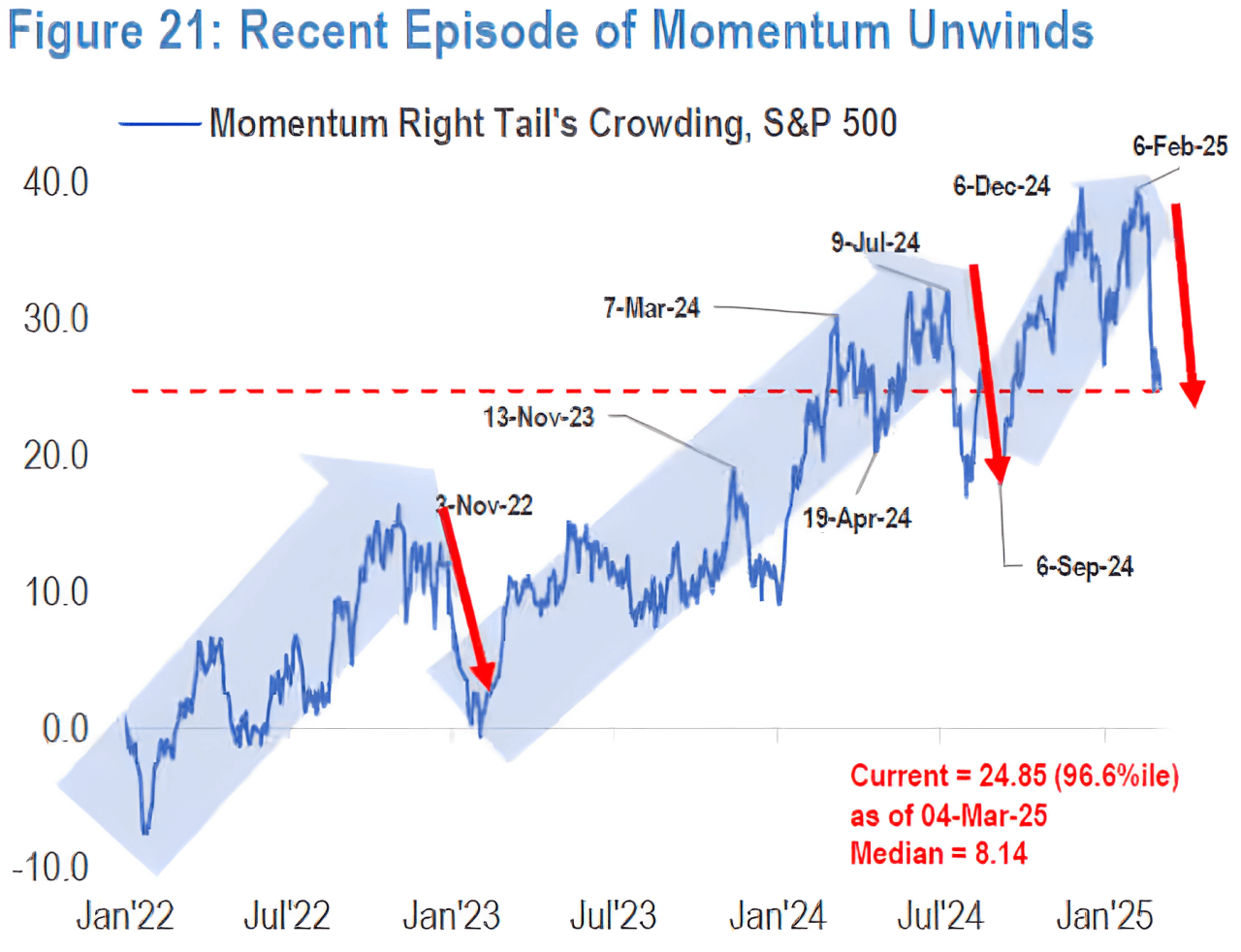This is a chart from JPMorgan that shows the past couple instances of the market experiencing sharp momentum reversals.