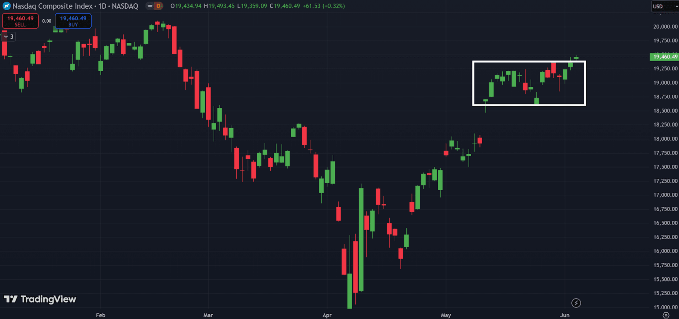 After yesterday’s close, the Nasdaq appears to have already broken out of its sideways consolidation, which I’ve marked in the white rectangle above.