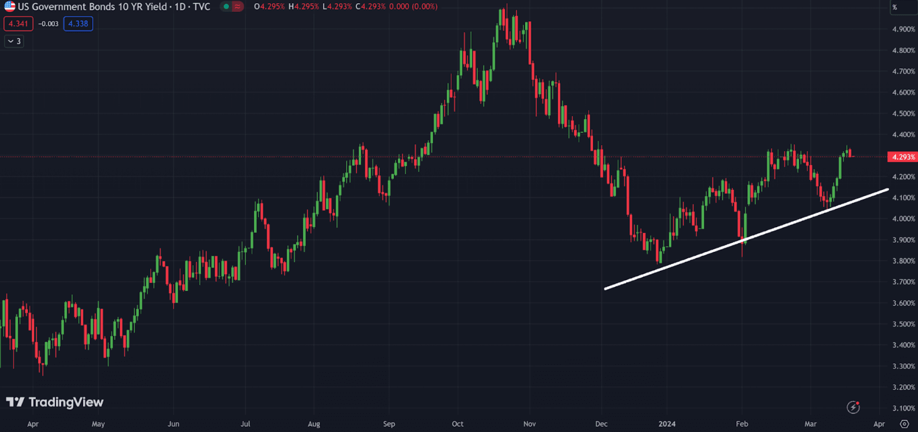 One look at this chart and you can see how the 10-year Treasury yield has been trending since the start of 2024 – upward.