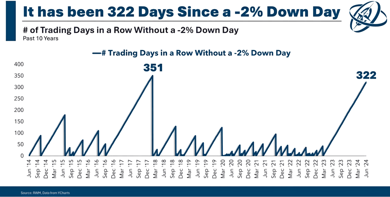 And yes, this includes the July–October pullback of 2023 – the S&P 500 still did not make a 2% down day during that period.