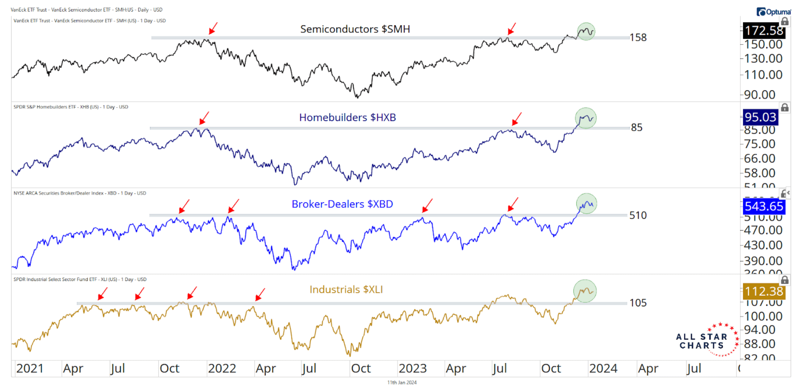 These are four sectors within the S&P 500 – semiconductors, homebuilders, broker-dealers, and industrials.
