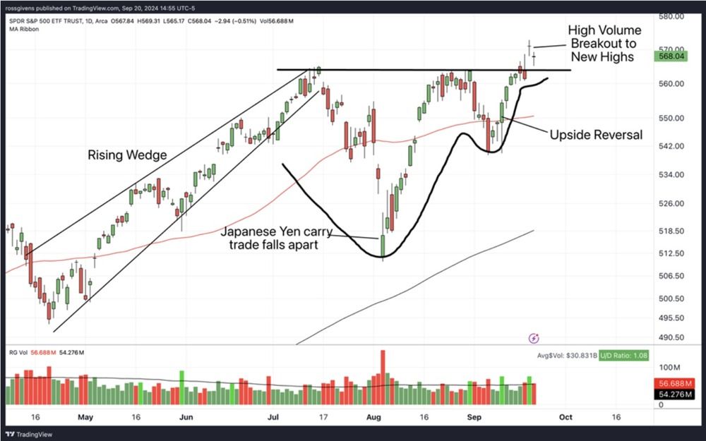 Then, after last week’s upside reversal following the CPI report and Wednesday’s 50 basis point rate cut by the Fed, the market broke out into new high ground on heavy trading volume.