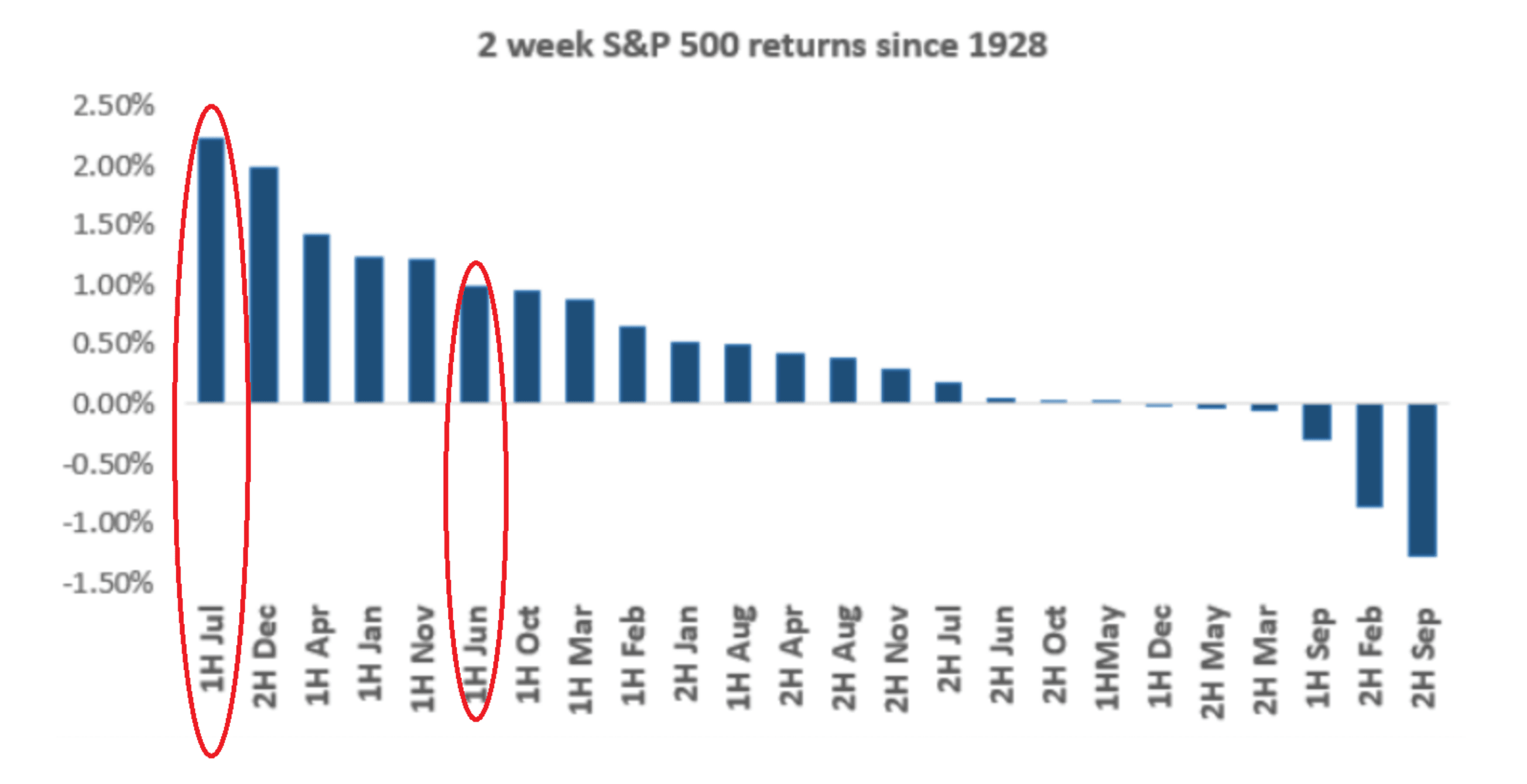 This chart shows the S&P 500’s average 2-week return for the first and second halves of each month, with the data being pulled from 1928 till today.