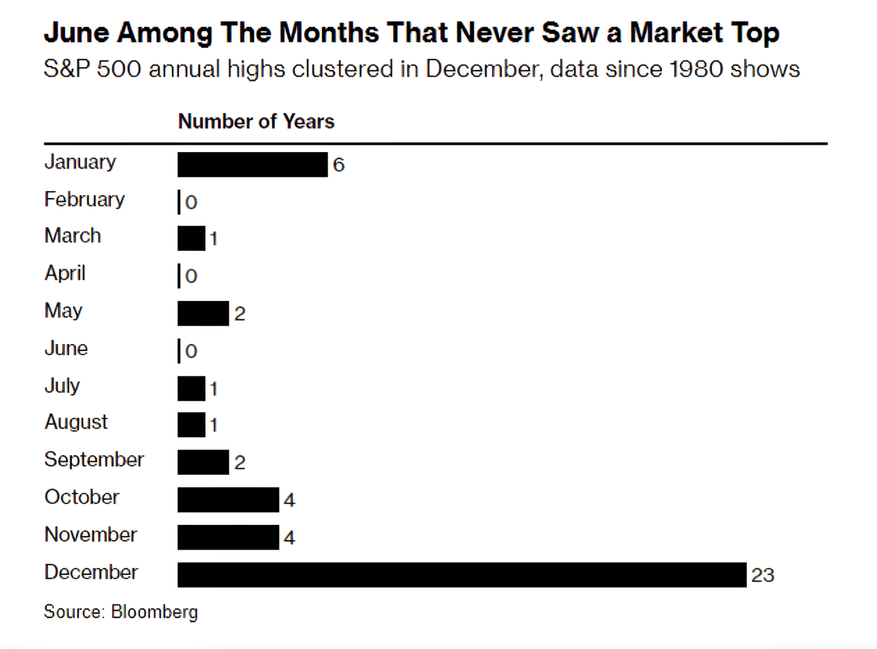 And as you can see, the index has never topped out in June – not even once – for the past 44 years.