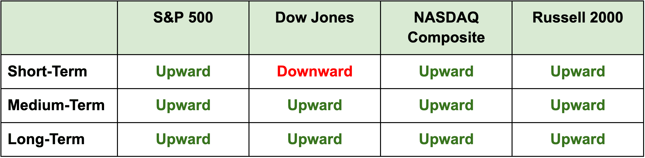 Note: All indexes except the Dow closed slightly higher yesterday. The short-term direction for the Russell 2000 is now back in the green.