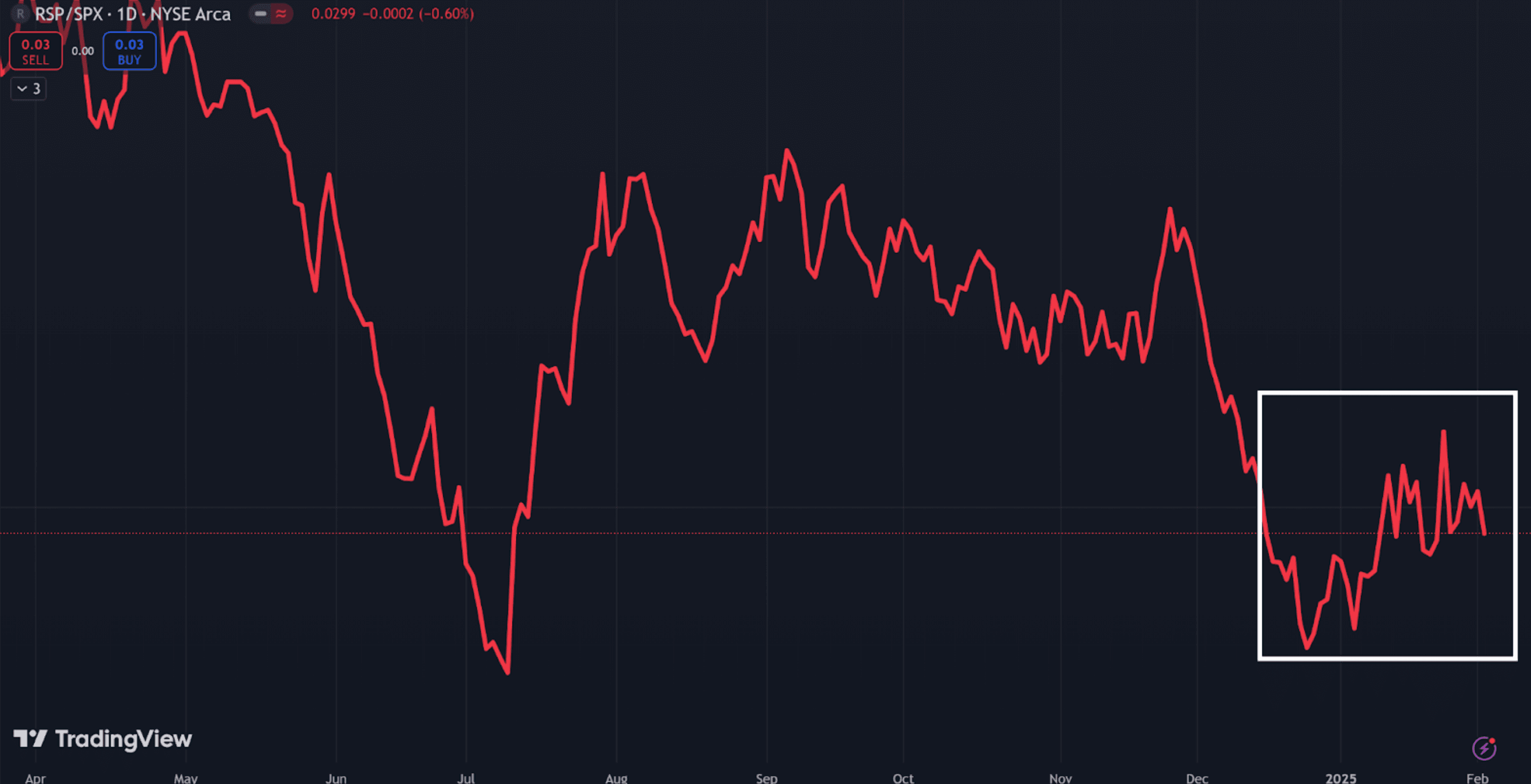 This is RSP/SPX – the ratio of the Equal-Weighted S&P 500 Index versus the normal S&P 500 Index.
