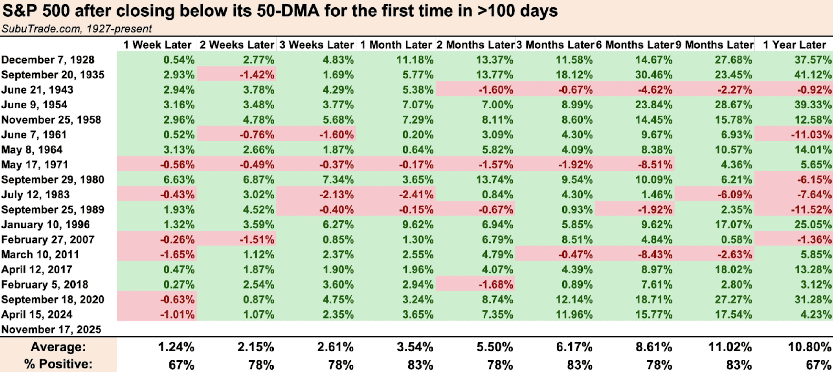 This chart shows how the S&P 500 has performed across various timeframes ranging from a week to 12 months after a 100-day streak above its 50-day moving average has ended.