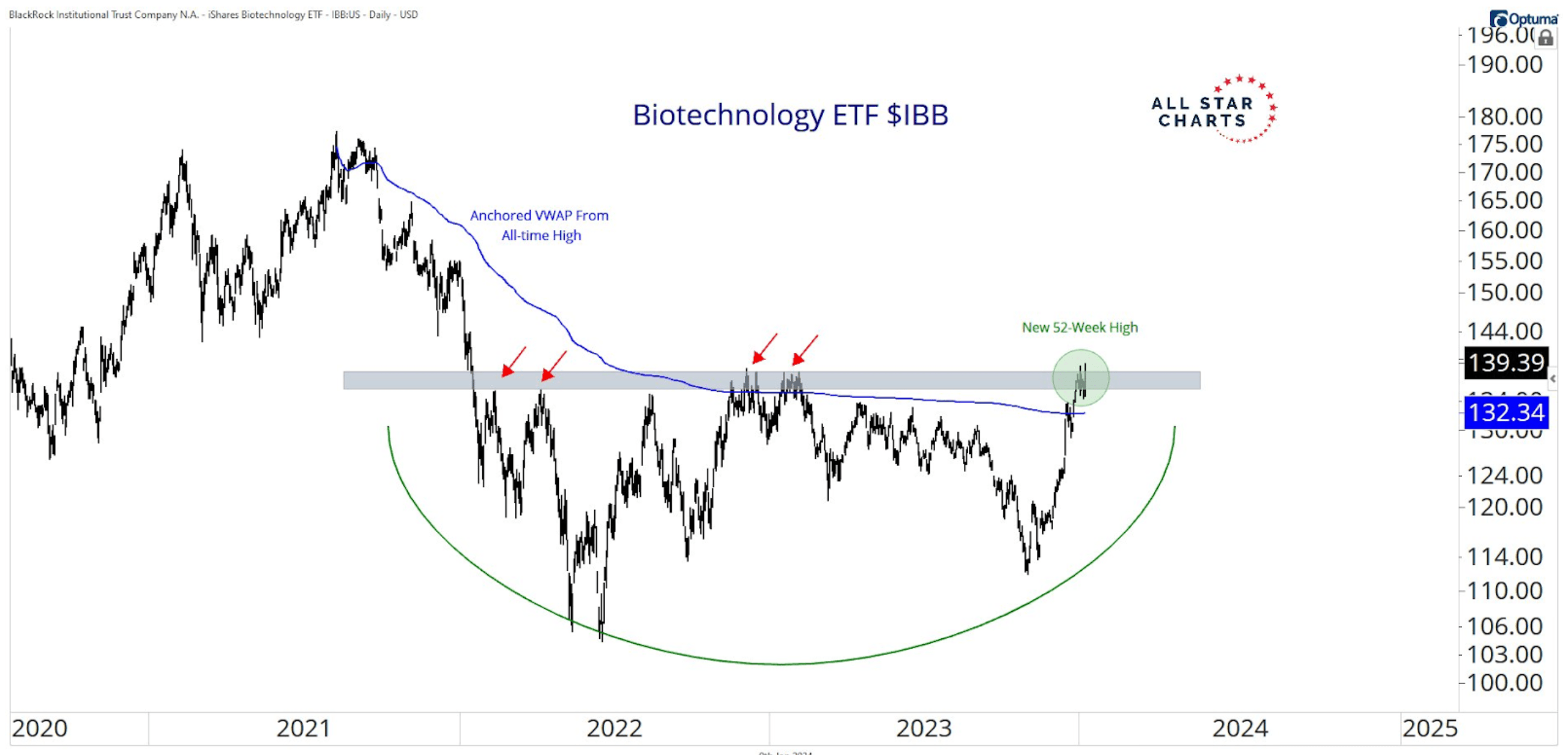 This is the biotech sector – as represented by an ETF – breaking out past resistance to new 52-week highs.