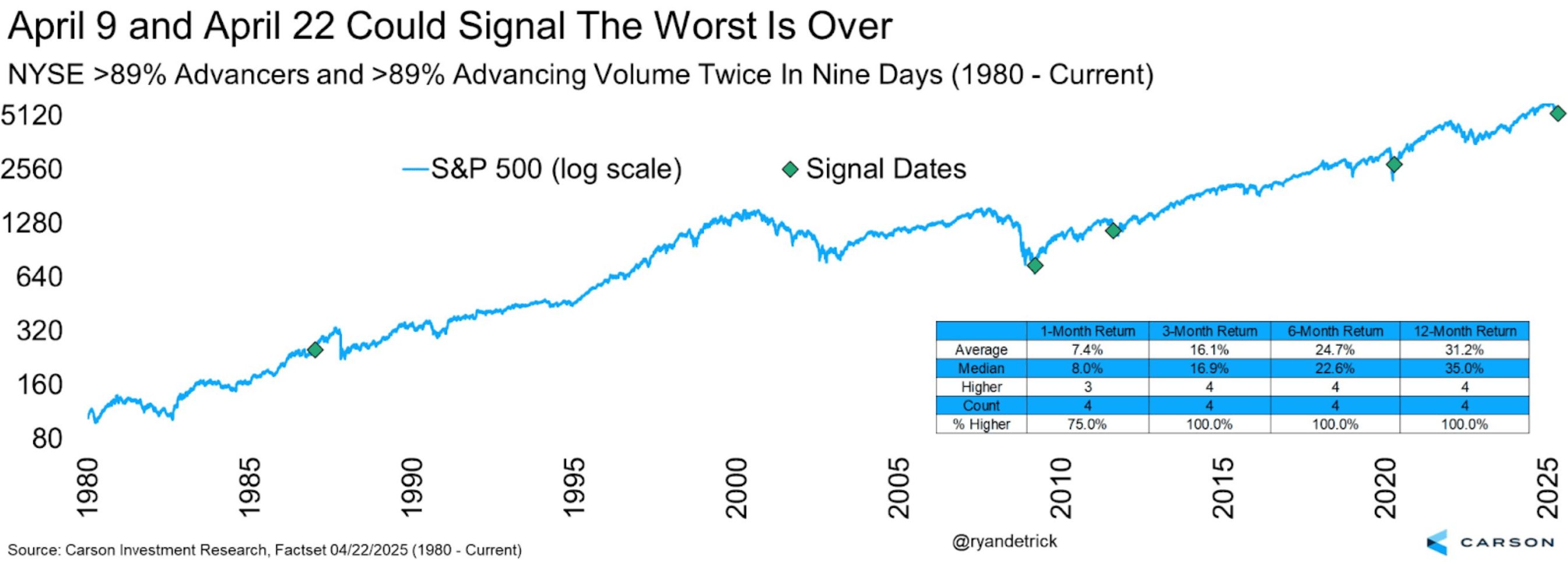 We saw a huge breadth day – with nearly 90% of stocks advancing – two weeks ago when President Trump announced the tariff pause.