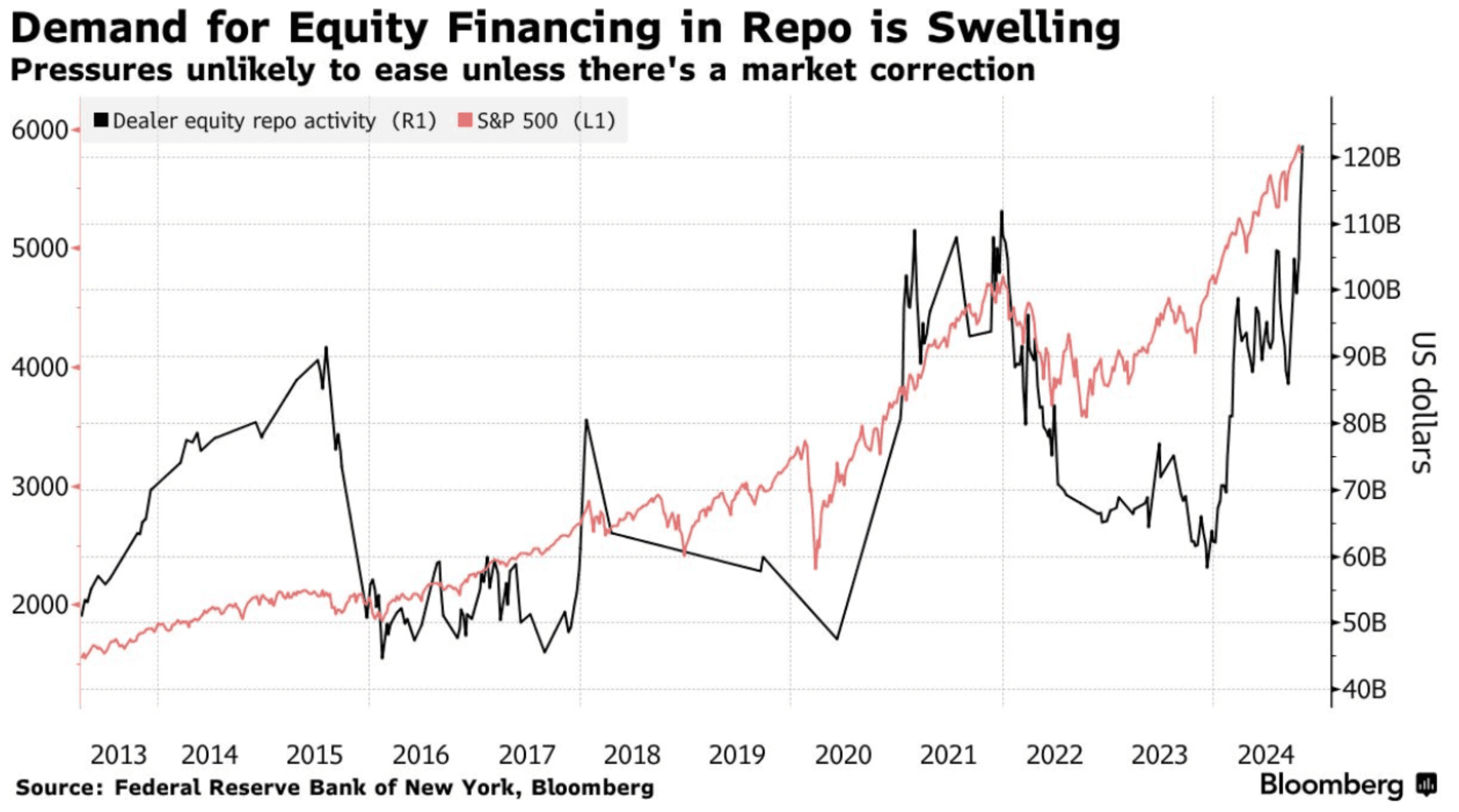This is a chart showing demand for equity financing repo activity in black versus the S&P 500 in red.