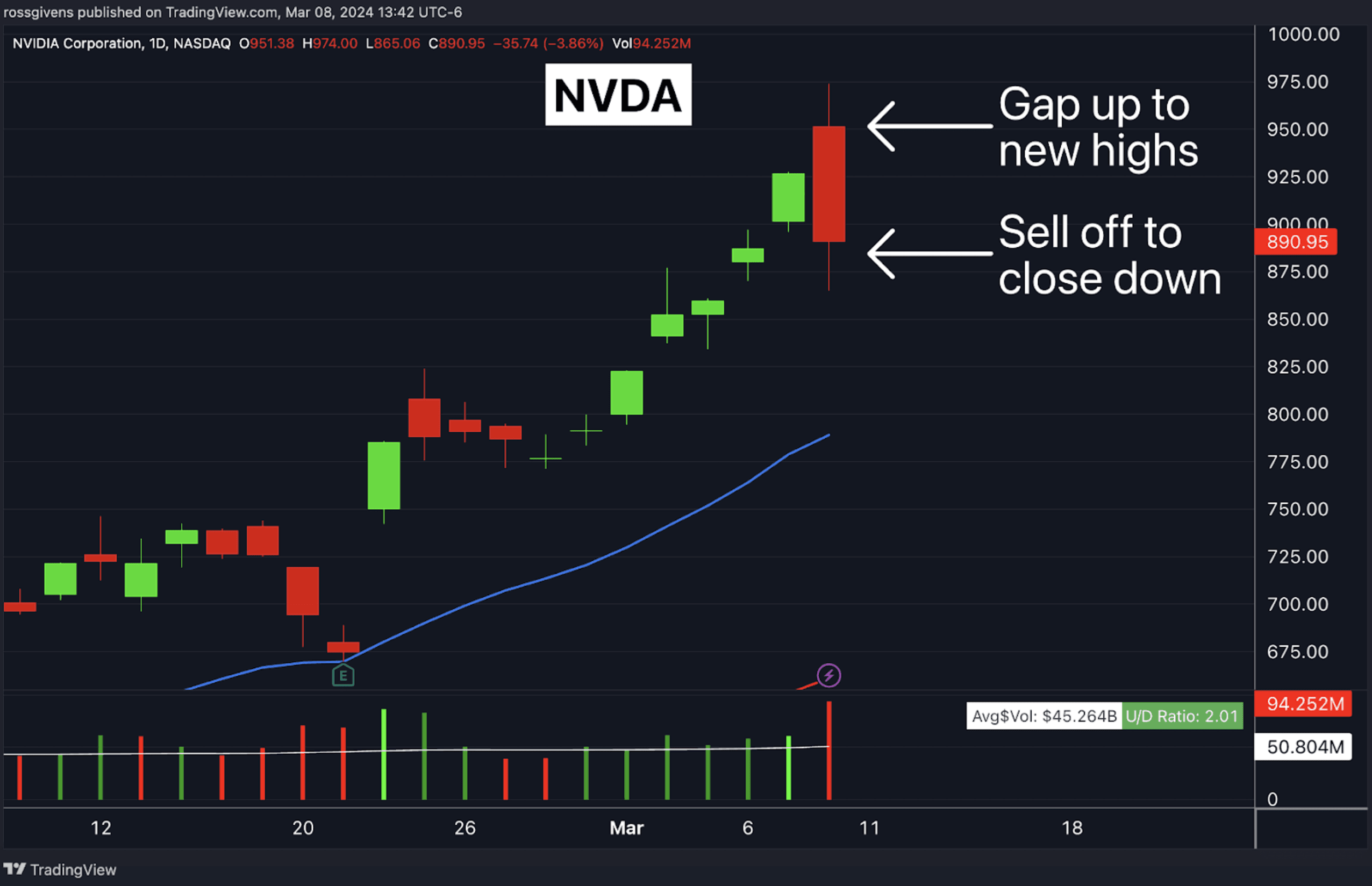 That pattern – gapping up to new highs before reversing to close lower for the day – is known as a “downside reversal”.