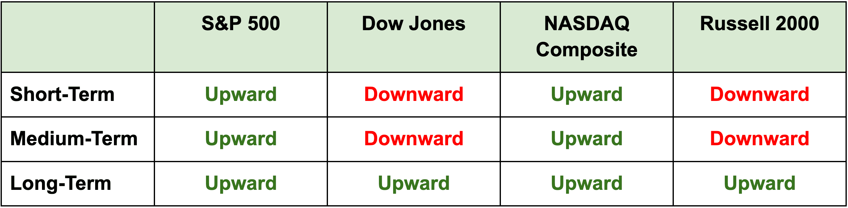 Note: Most indexes closed slightly positive yesterday, with the exception of the Russell 2000 which dipped – sending its short and medium-term directions downward.