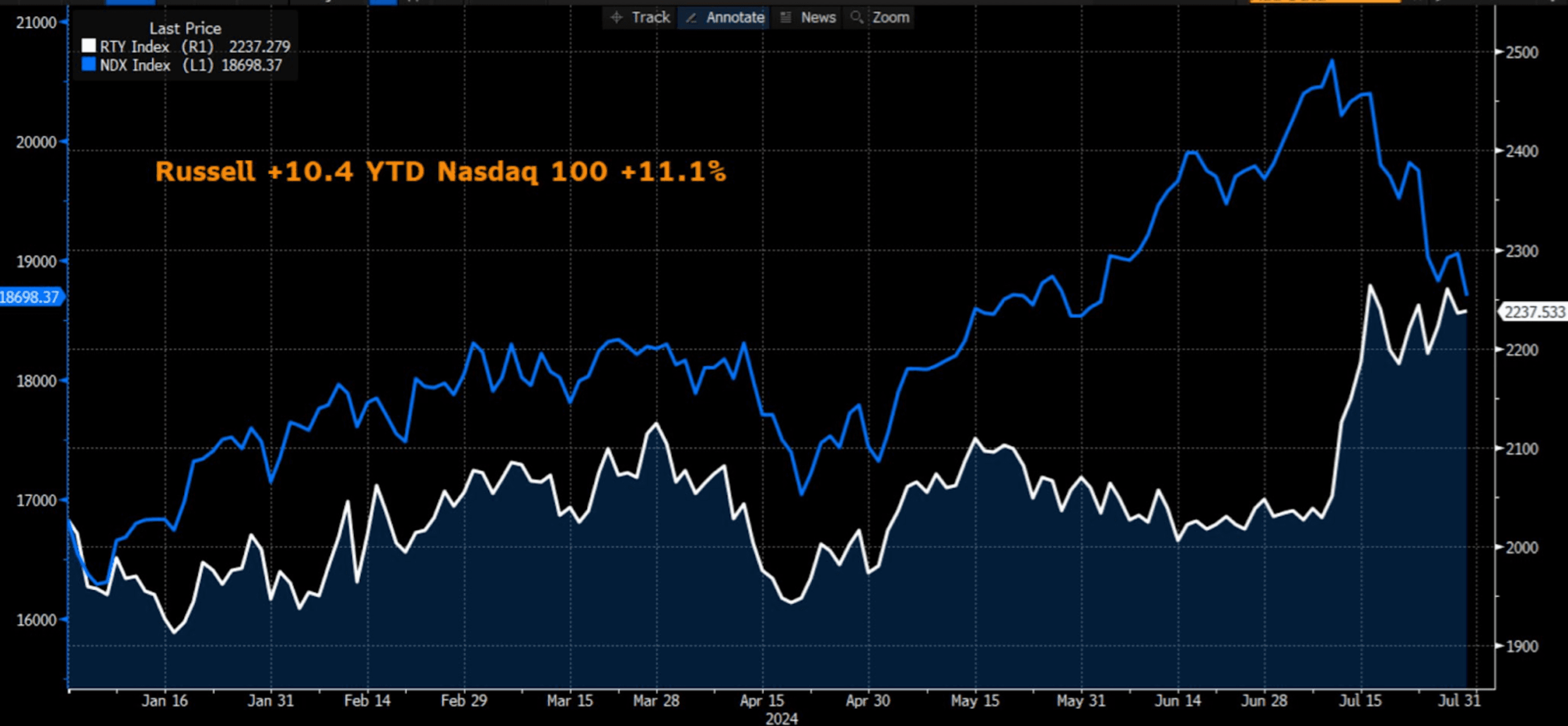 This is the year-to-date chart comparing the Nasdaq 100 – the 100 largest tech stocks on the market – with the small-cap Russell 2000.