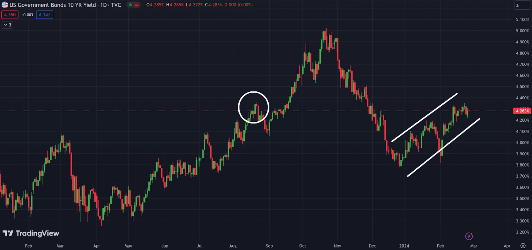 This is a chart of the 10-year US Treasury yield, which tends to be inversely correlated to stock prices.