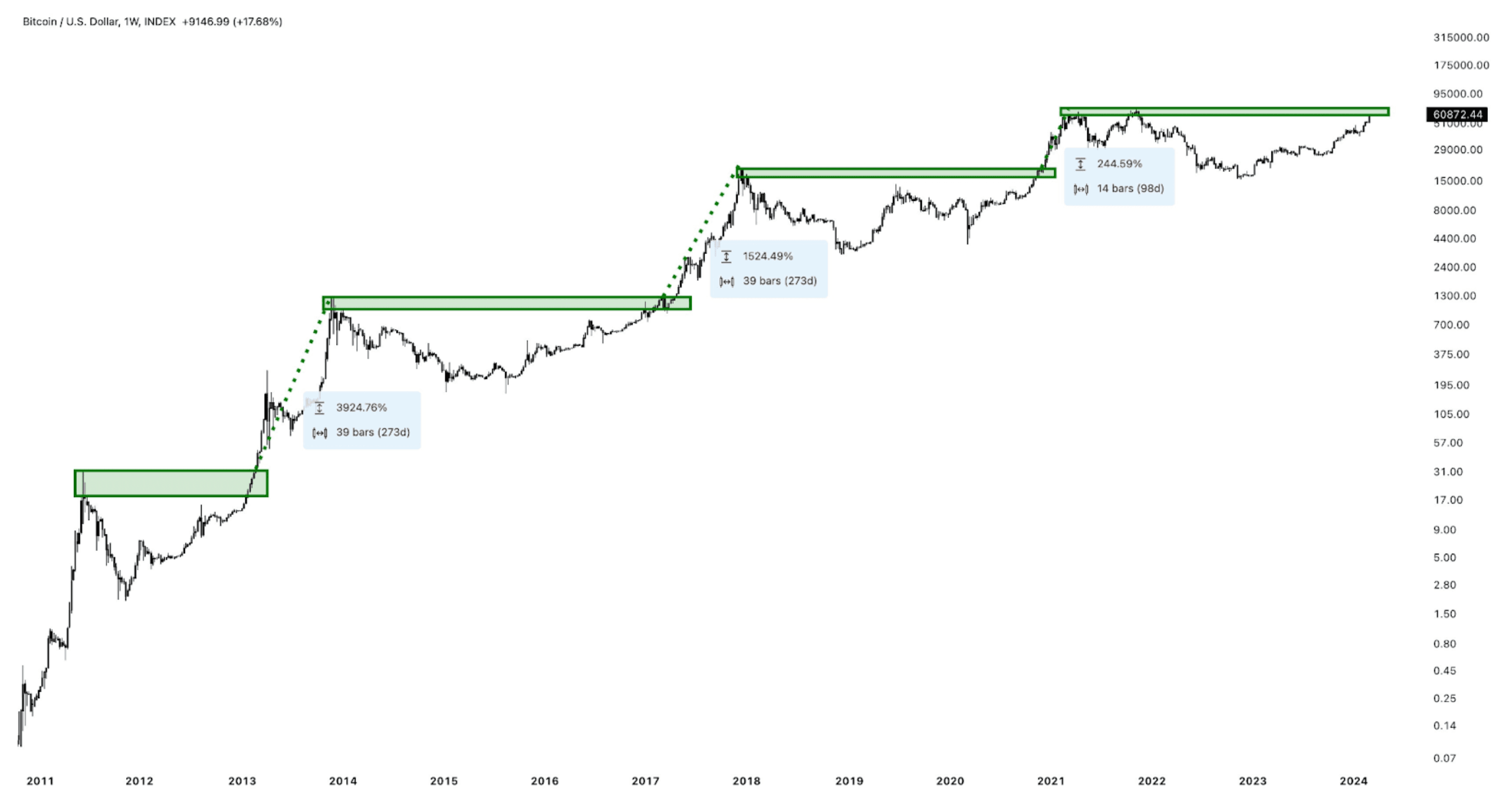 Now, while Bitcoin’s current price is still a ways off from its all-time high of $69,000 back in November 2021, its price is now bumping into defined resistance levels (green line on the upper right).