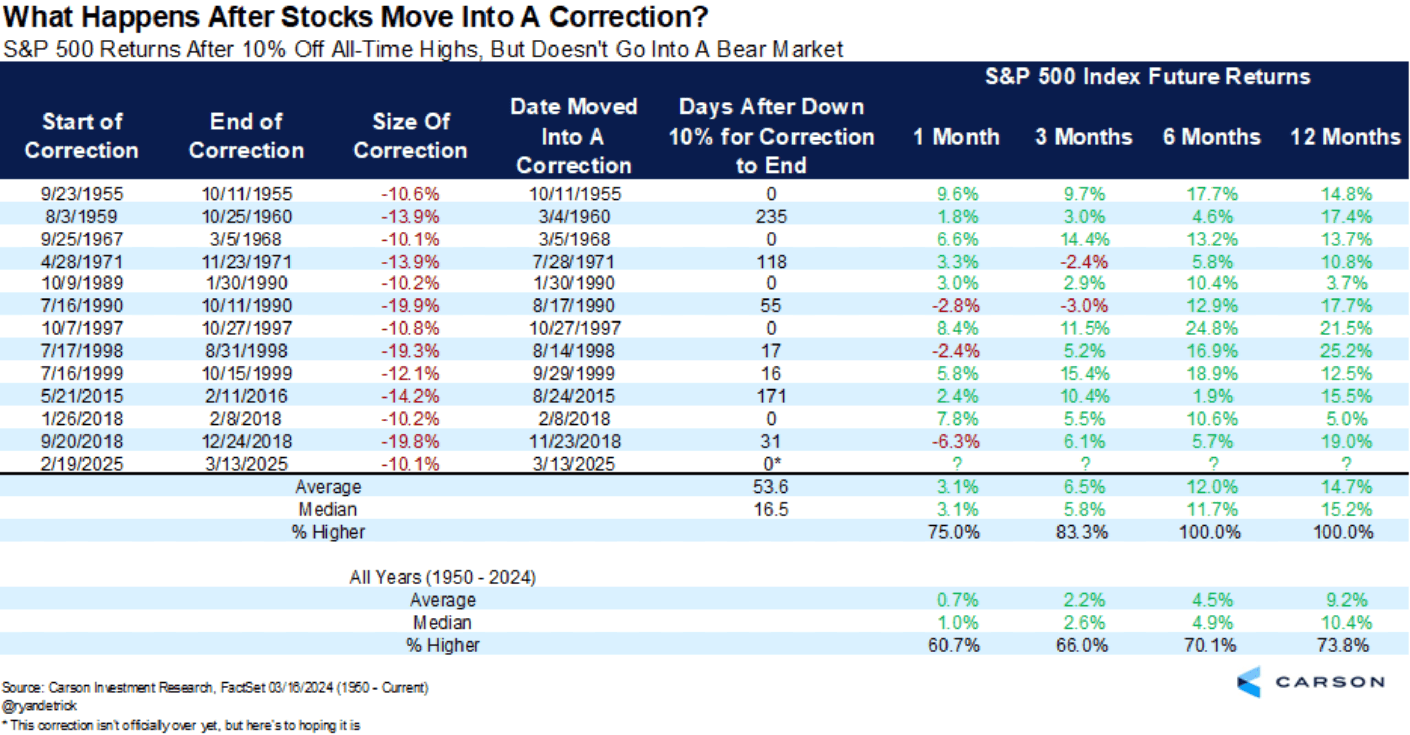 This chart shows all the instances where the S&P 500 moved into correction territory (down 10% from highs)...