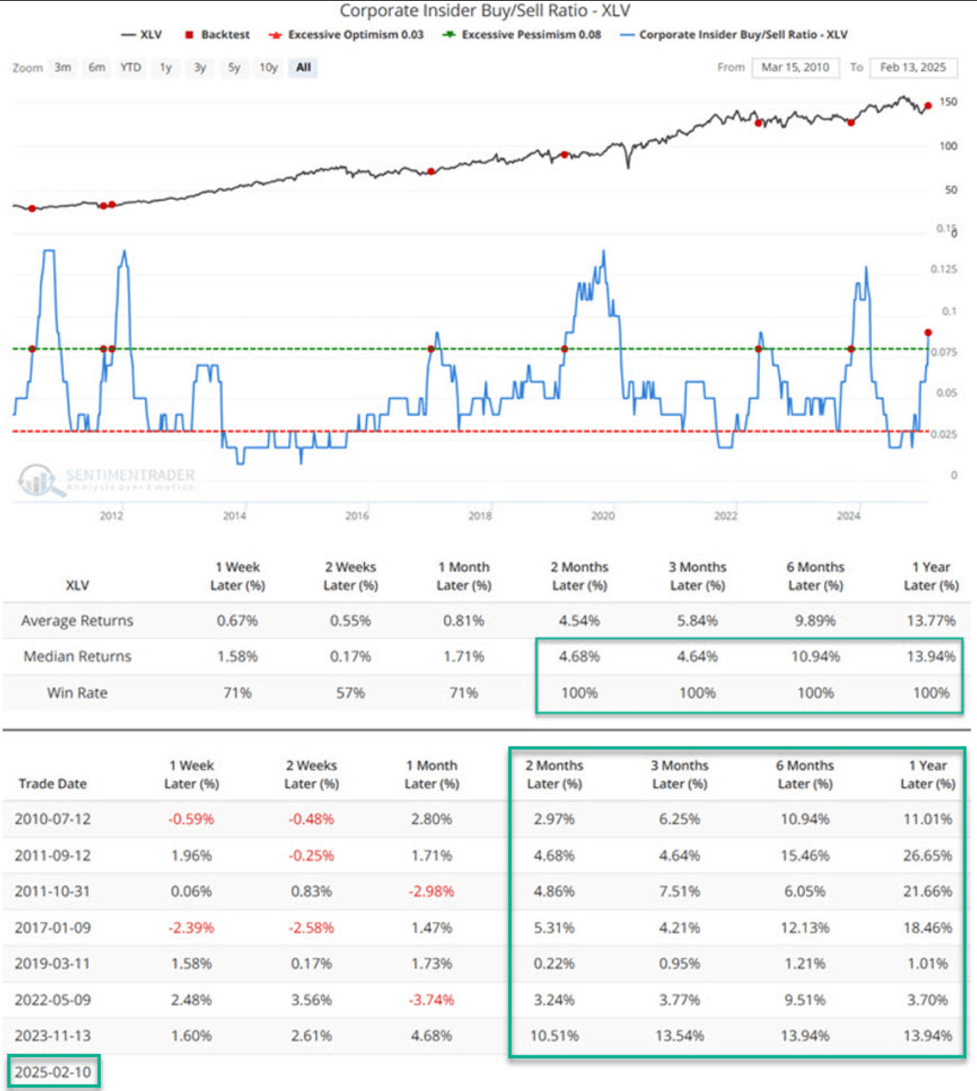 This is a chart overlaying the performance of XLV – the S&P Healthcare ETF – with the corporate insider buy/sell ratio.