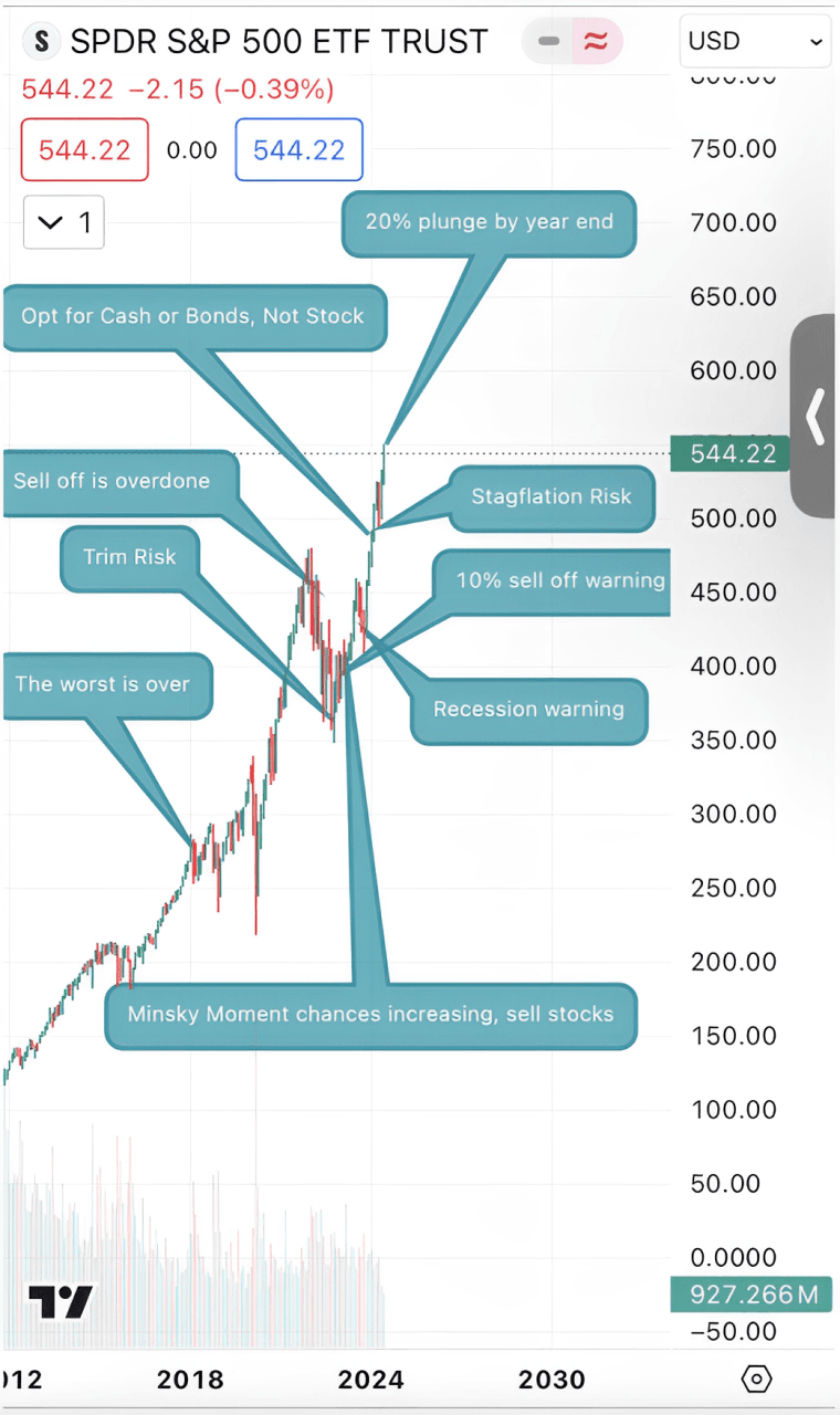 This is the S&P 500 with Kolanovic’s previous predictions mapped out on the index.