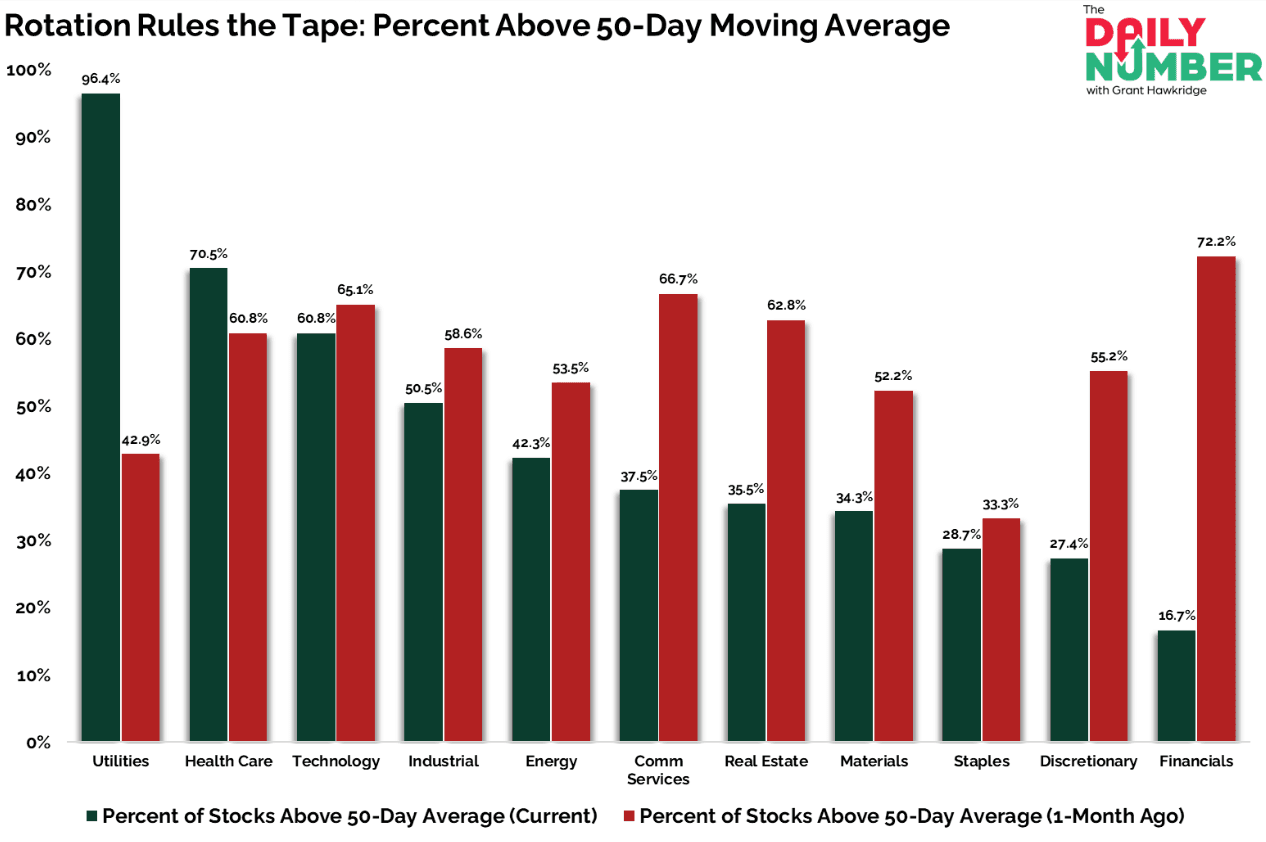 The chart below shows the percent of stocks in each sector trading above their 50-day moving average (a sign of medium-term direction).
