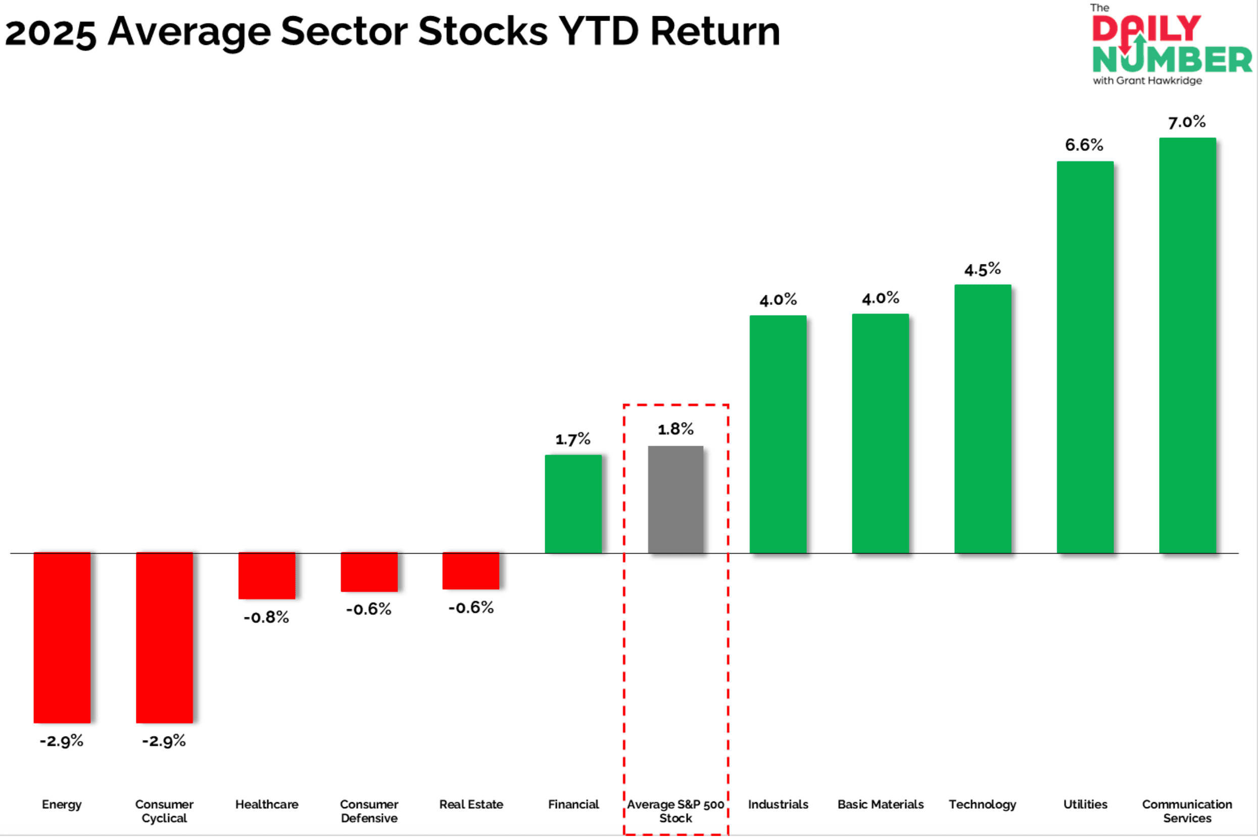 The chart above shows how the “average” stock in each S&P sector – as well as the overall S&P 500 itself – has performed year-to-date.