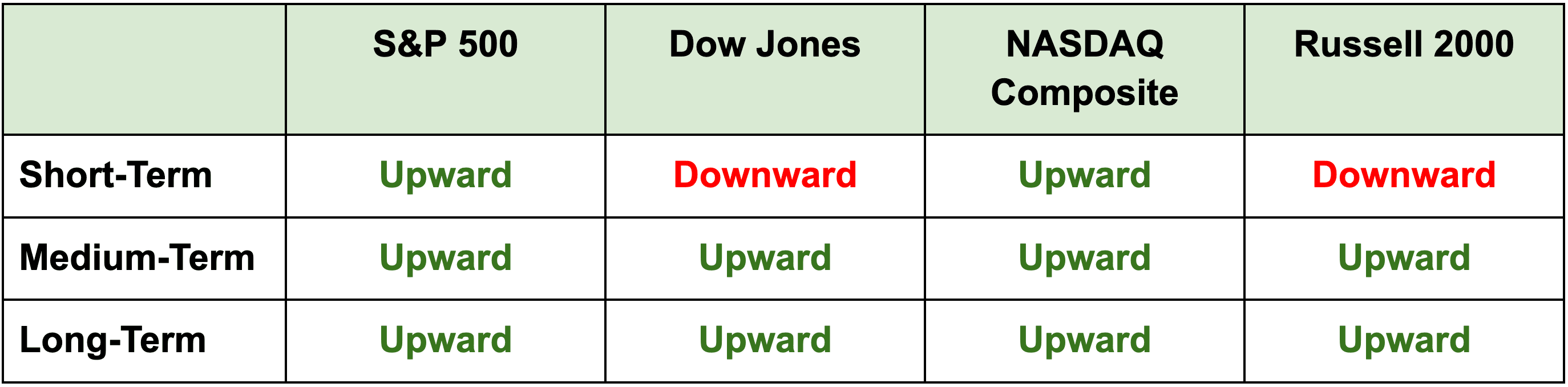 Note: Only the Nasdaq closed higher last Friday – which was reflective of the entire week’s performance. The short-term direction for the Russell 2000 flipped downward.