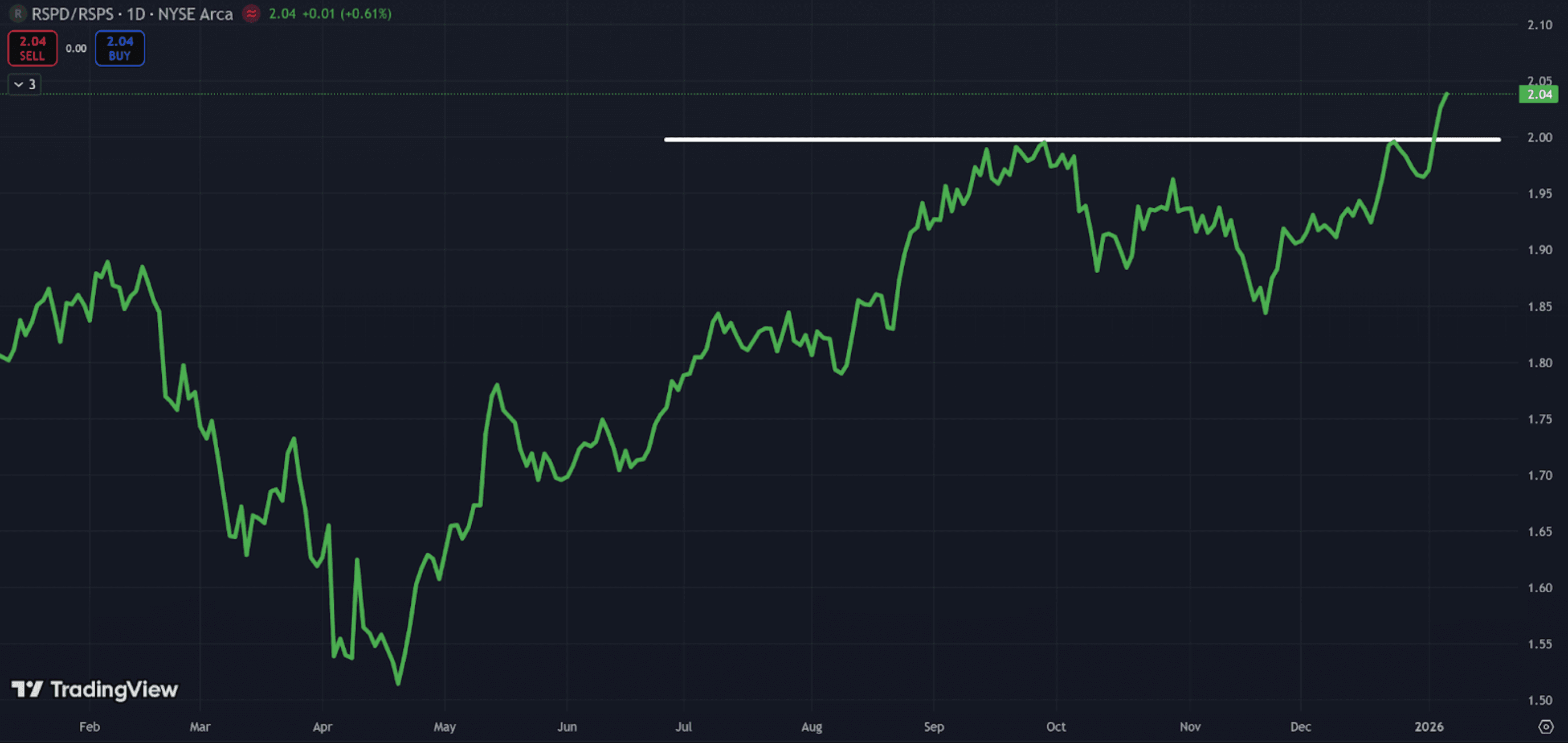This chart shows the ratio of the Equal Weight Consumer Discretionary ETF (RSPD) to the Equal Weight Consumer Staples ETF (RSPS).