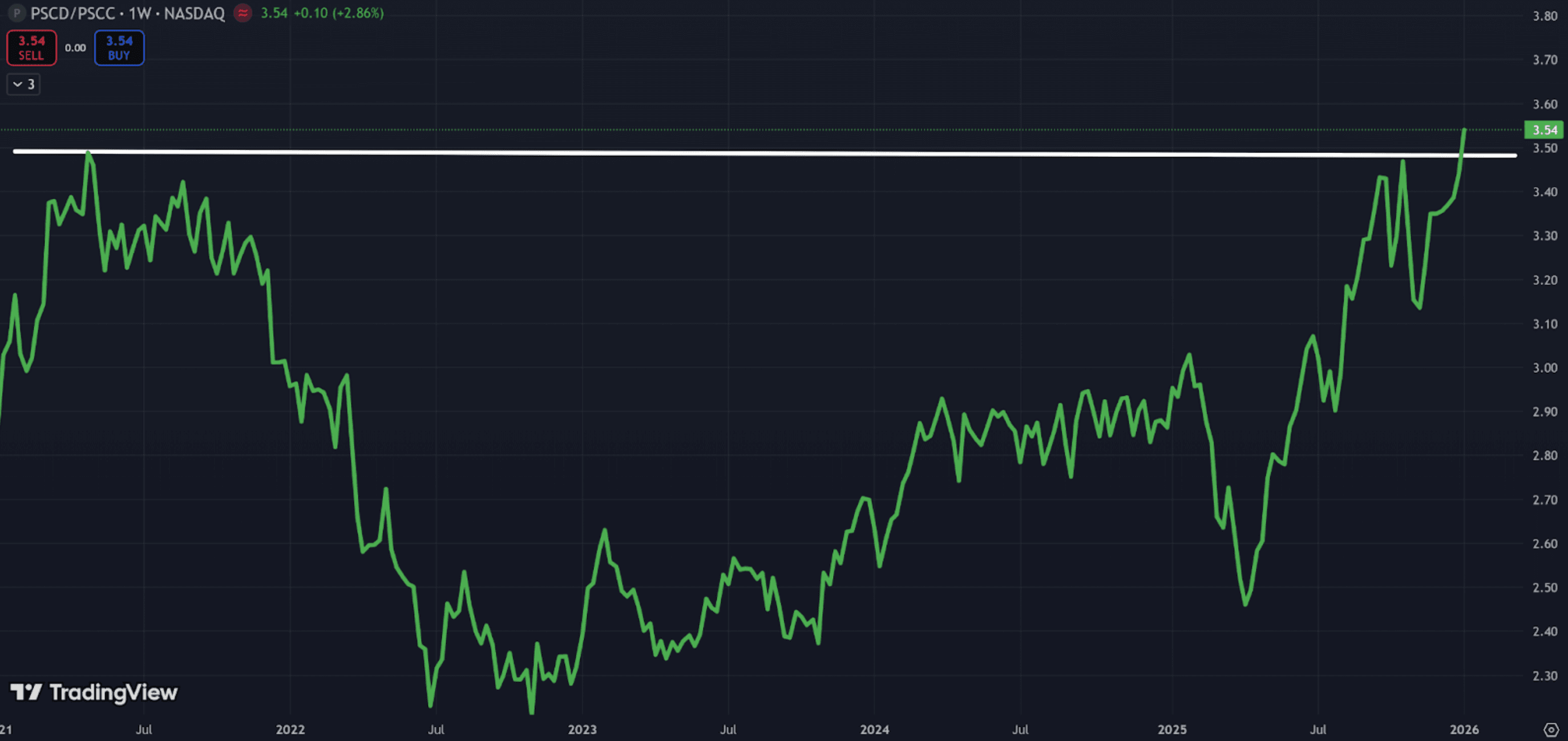 This is a 5-year chart of the Small-Cap Discretionary ETF (PSCD) versus the Small-Cap Staples ETF (PSCC).