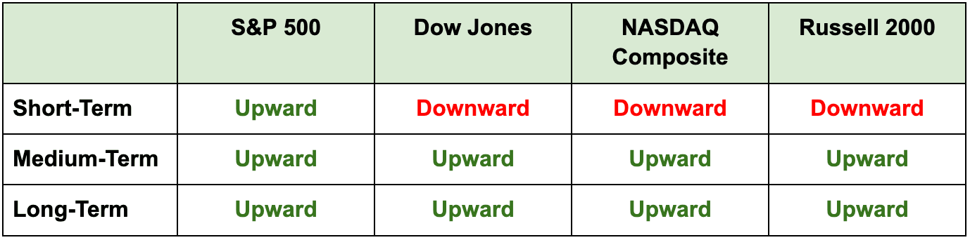 Note: All indexes closed lower Friday – except the Russell 2000, which closed marginally higher. The short-term directions for the Dow and the Nasdaq flipped downward.