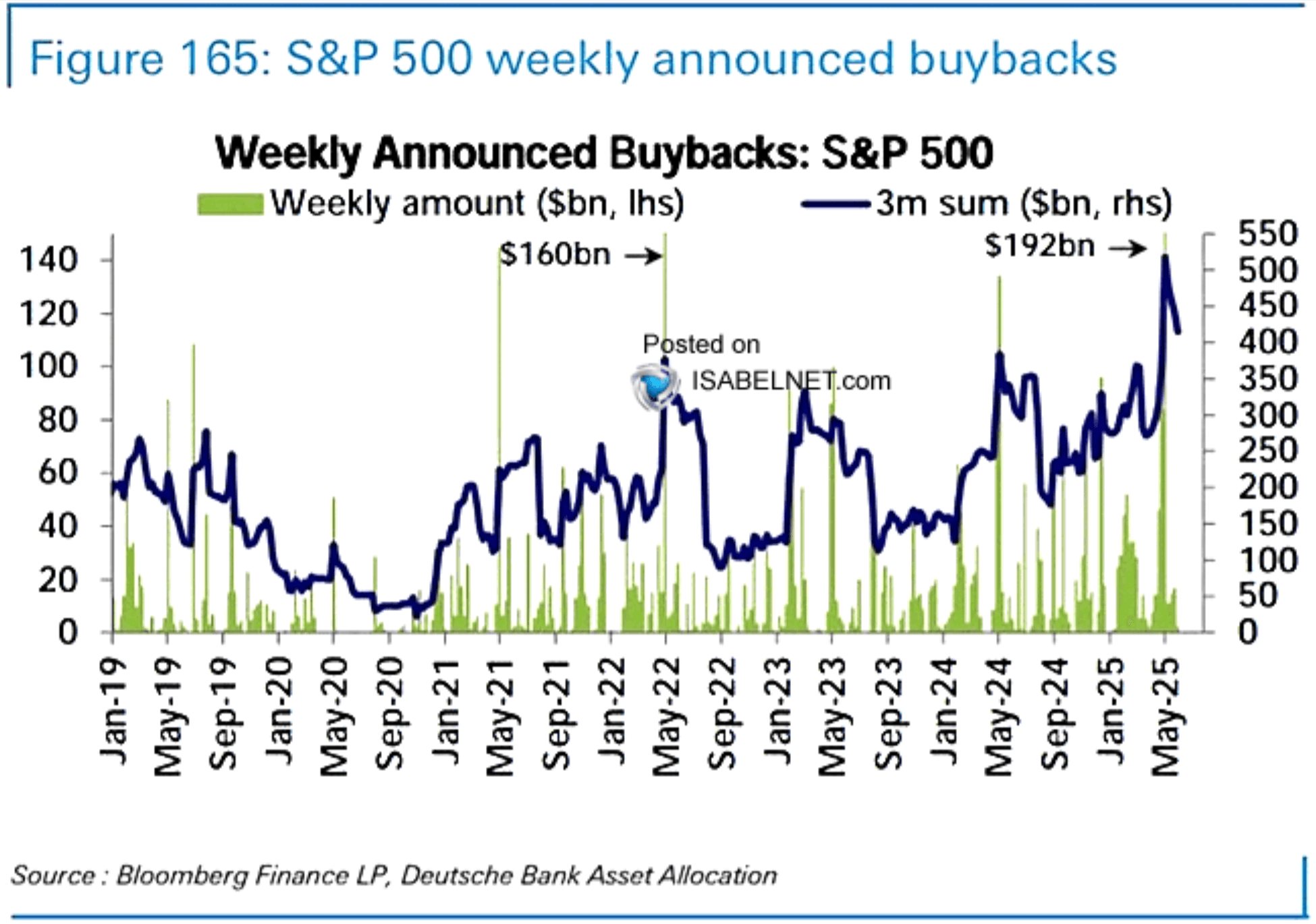 This chart shows the billions in stock buybacks announced by the S&P 500 companies every week.
