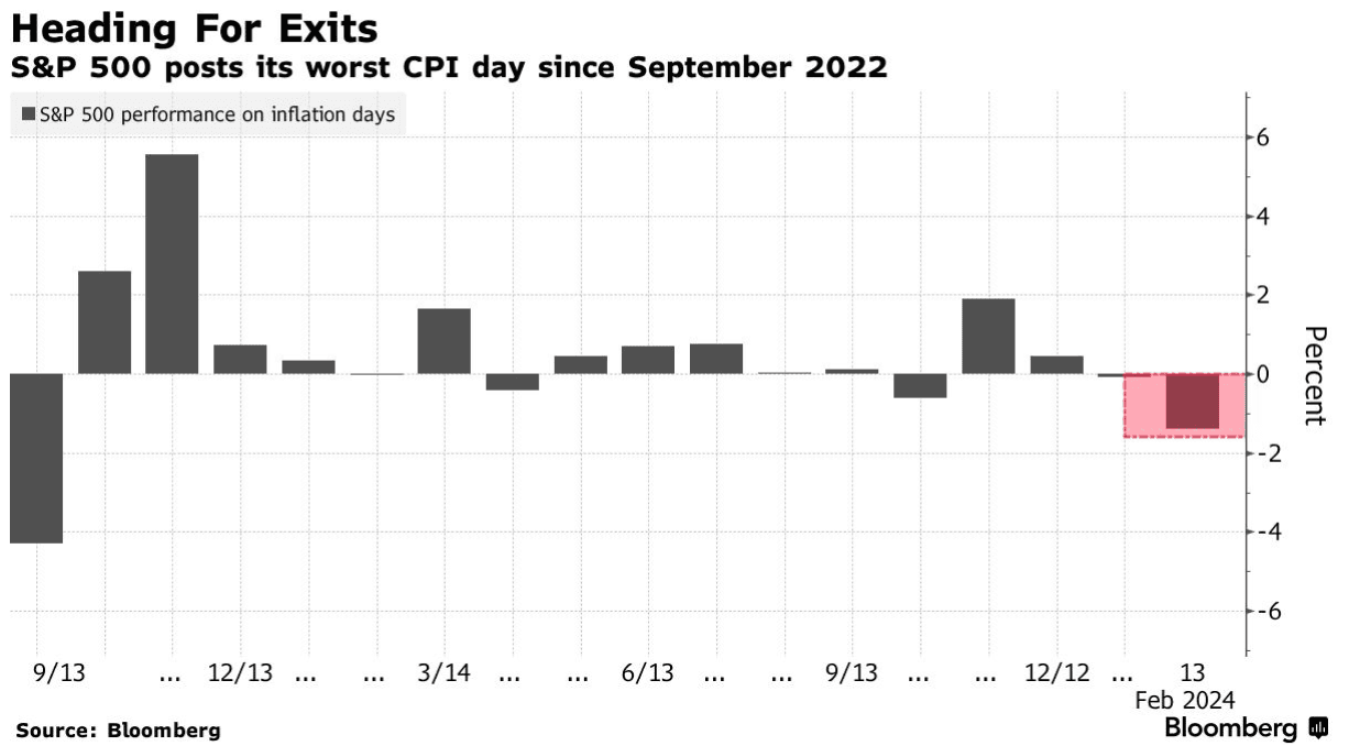 The downward move in stocks after yesterday’s hotter-than-expected inflation print was the worst on record since September 2022.