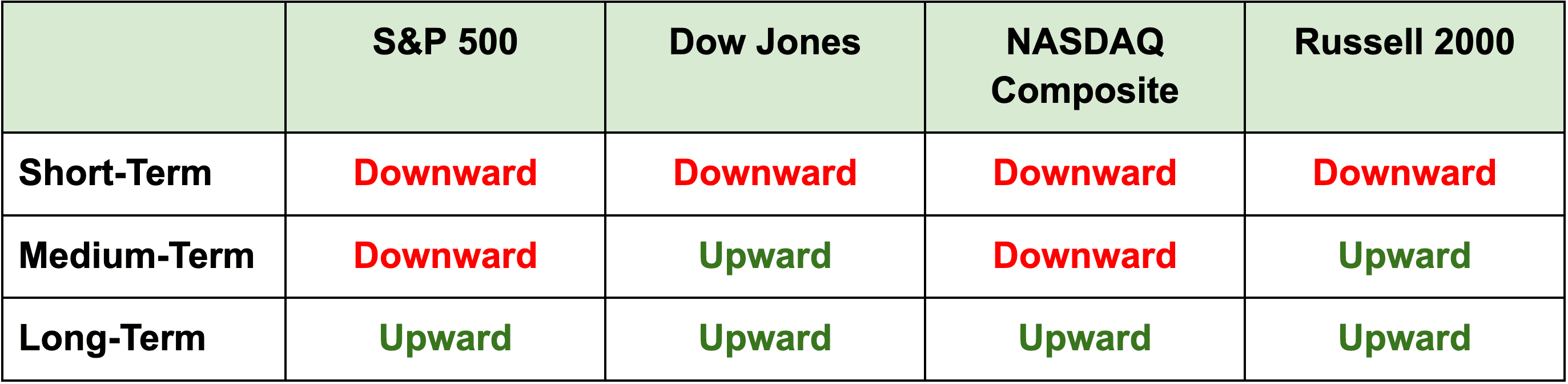 Note: All indexes closed lower to close last week as recession fears increased. The short-term directions for the Dow and the Russell 2000 flipped downward. All long-term directions remain solidly upward so far, however.