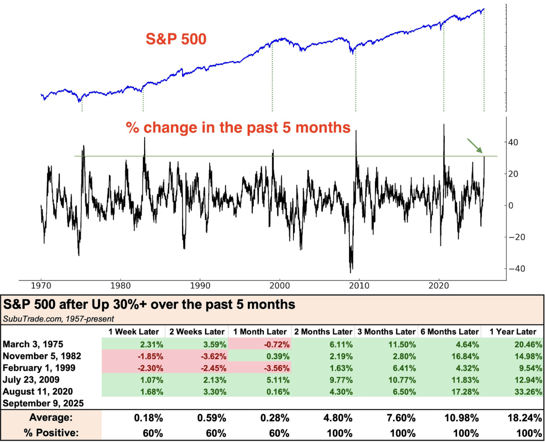 Plus, as the data shows, every time the S&P 500 has surged over 30% in five months, subsequent returns have been overwhelmingly positive.